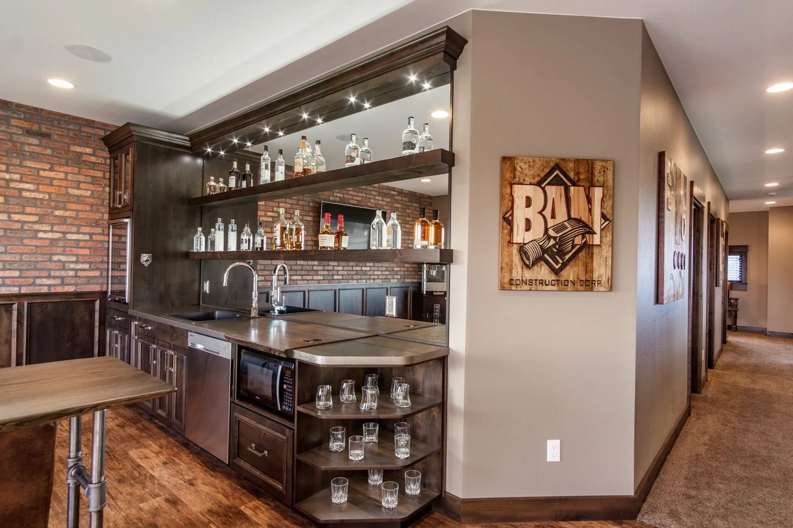 If you’d prefer beer or soda with some popcorn, then head to the second floor pub room. A wet bar introducing the latest metal-look laminate top with a cutting block made from the ash tree serves up the goodies. Floating shelves cap off the end of the bar in artsy fashion. A lengthy slab of the ash tree serves as a high-top table conveniently located behind the leather sofa. A flat screen TV mounted on the far brick wall marks the perfect distance to catch the game.