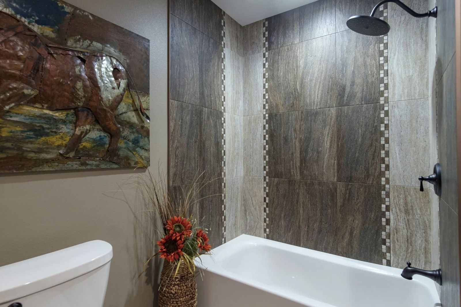 The en suite of another bedroom uses a combination of light and dark tile for the shower and tub. The large tile is trimmed with vertical rows of one-inch tile. This small-tile design also makes a striking backsplash for the double sink vanity. Metal pendants dangle above.