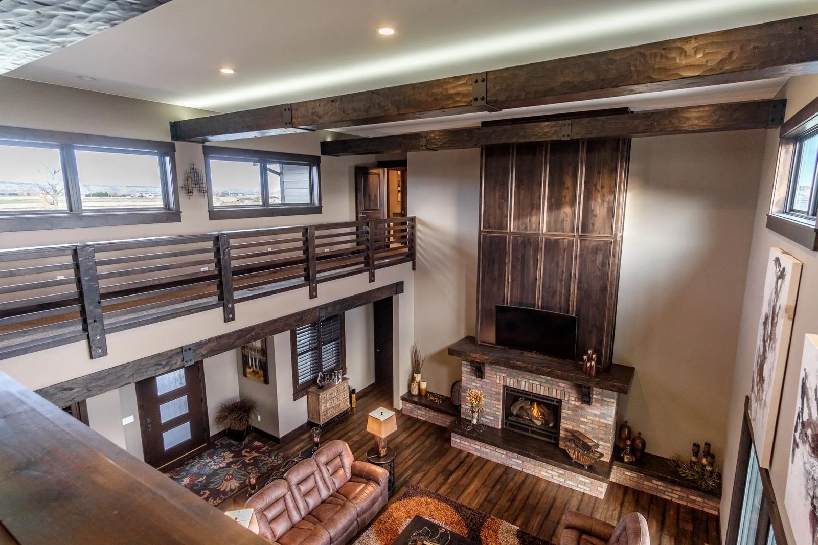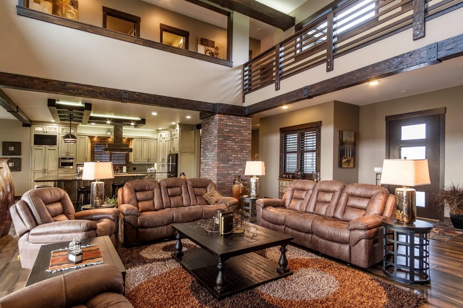 Dark wood trim and the impressive beams continue around a plump brick column into the great room. Soaring twenty feet above, the floating beams cast visual interest to the L-shaped walkway overlooking the main floor. A soft leather grouping of sofas and chairs from Time Square Furniture & Mattress fit the space exceptionally well.