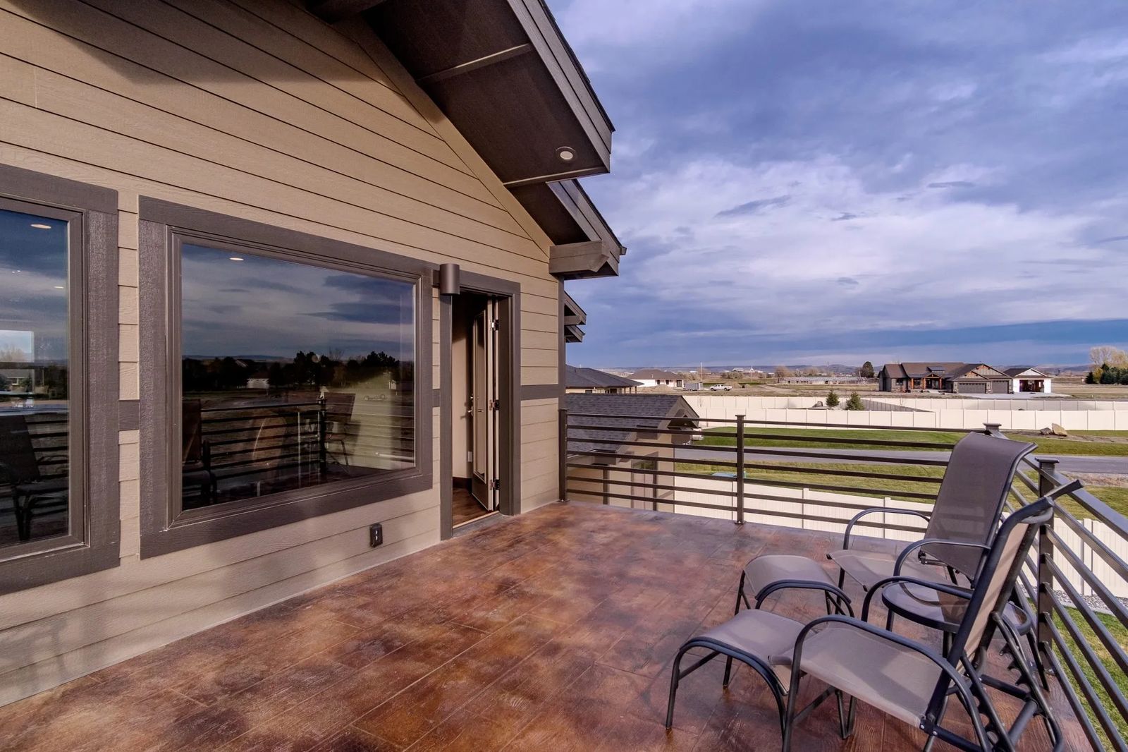 Windows and an over-sized glass door offer mountain views, in turn, initiating that laid-back attitude. For a breath of fresh air, just step out onto the wood-inspired concrete patio. This second-story balcony is well supported from the patio below and guarded round-about with metal railing by Artistic Iron.