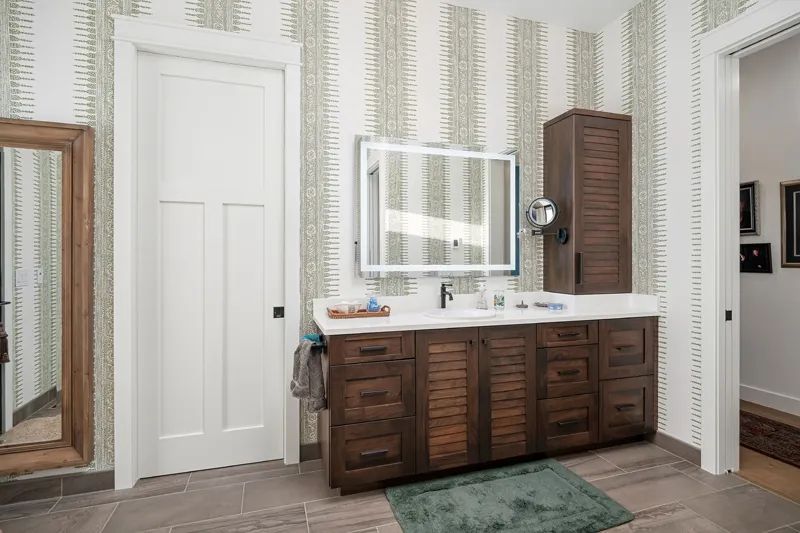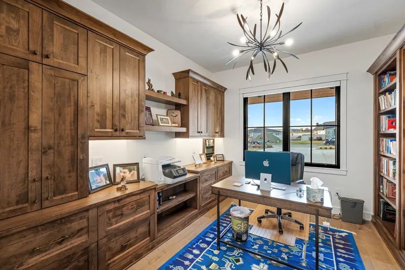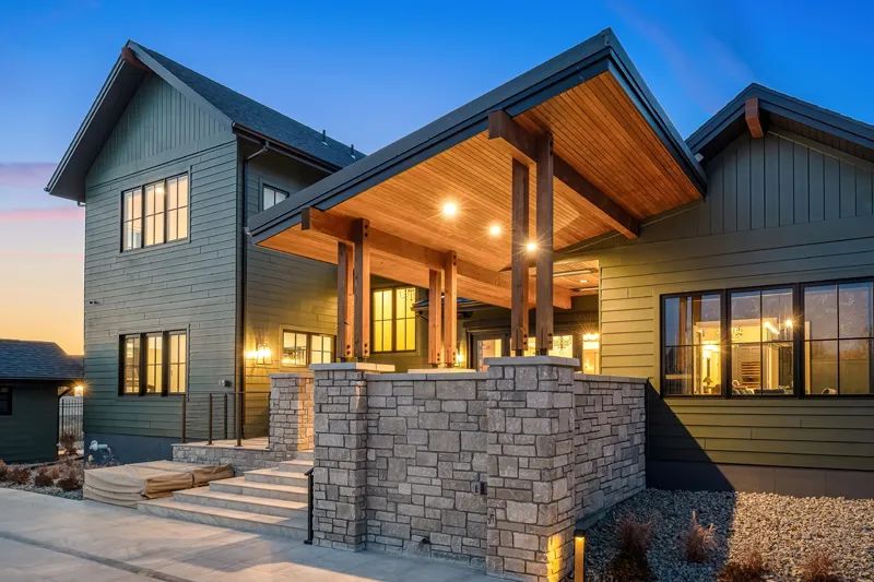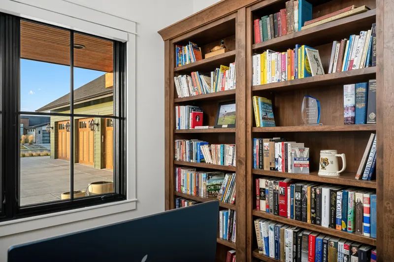 From the spacious driveway, this contemporary craftsman home is covered in Owens Corning onyx black shingles and tumbled silver tip limestone giving the home a dynamic and inviting appearance. Mahogany garage doors match the front door, opening to a space that is both dynamic and charming. Walnut wood flows throughout most of the home not only in the trim but with interior built-in cabinets.