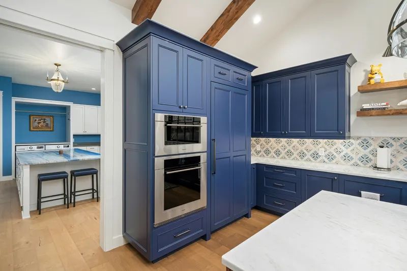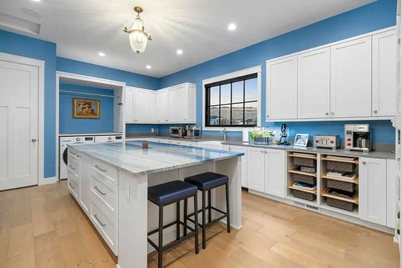 Directly off the kitchen, the butler’s pantry serves as a functional workspace for a variety of things, housing small appliances, an ice maker, a washer and dryer, tons of storage, and a gorgeous island/workspace. One unusual, highly functional feature is what the Cobbs refer to as the “Costco entrance.” The full-size door, when opened from the pantry, has ample shelving space. On the opposite side, a door opens directly from the garage to easily bring things in to store.
