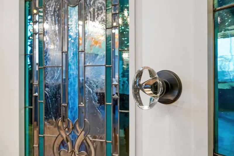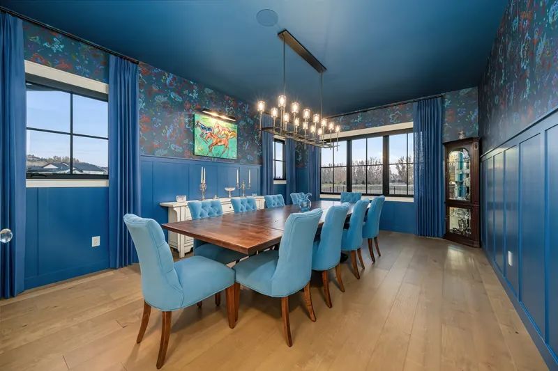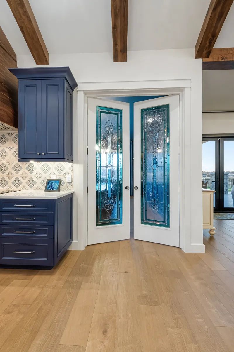 Two sets of leaded stained-glass double doors open into a classic dining room and into the master suite as well. The doors were designed in Billings by Susan Sommerfeld of Kennedy’s Stained Glass. “Carla and her designer brought in colored swatches, design patterns, and tiles as examples to use in the glass,” Susan says. “Then we determined how much light they wanted to shine through — adding a more transparent look and feel to the dining room, and for privacy, less light coming in through the master suite.”