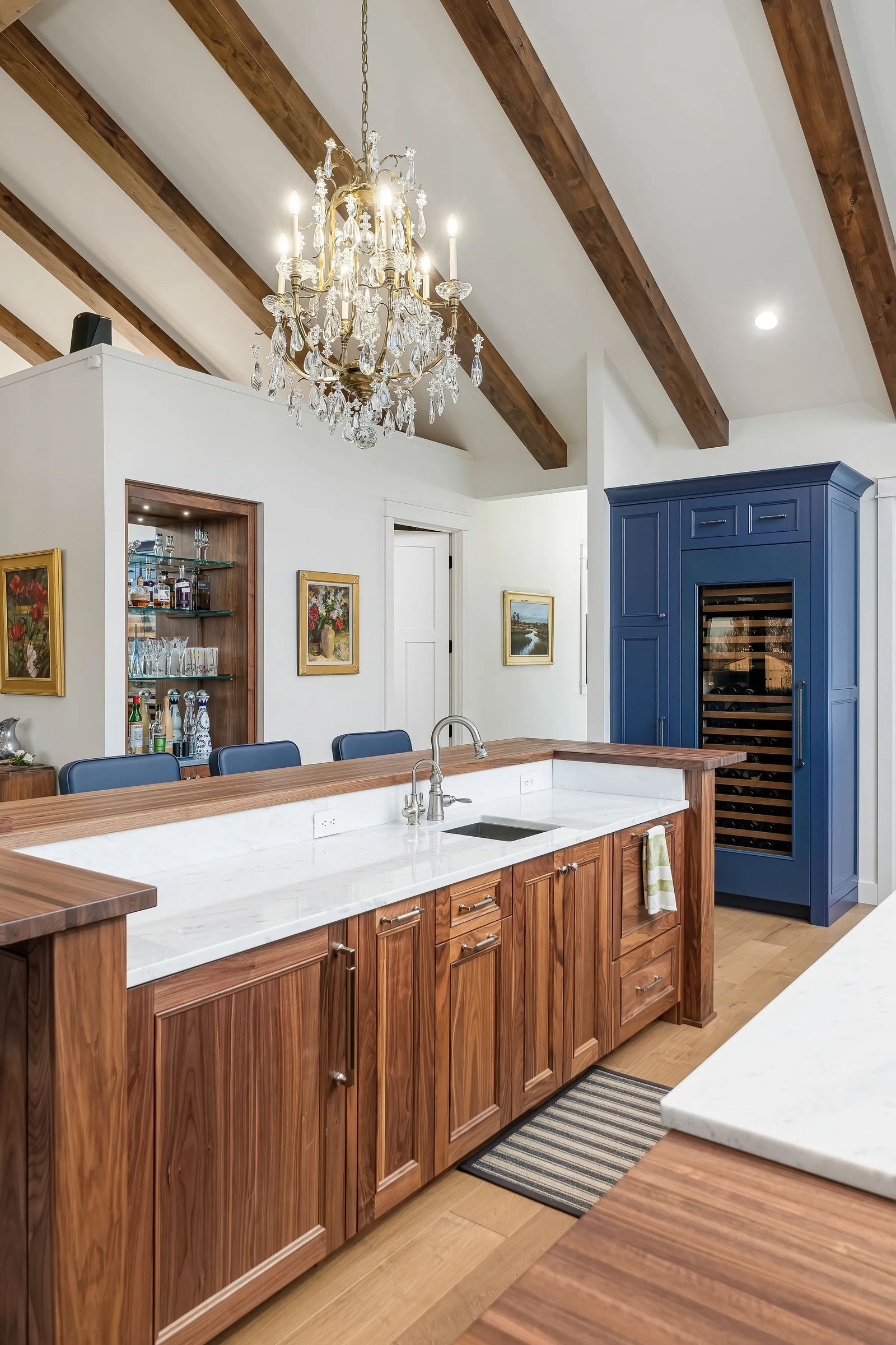 The countertops and kitchen Island in both spaces were from Magic City Granite and are made of Quartzite. The tile on the kitchen walls, laminate flooring, and carpeting was installed by Pierce Flooring. There is also a bar with plenty of seating and a wrap-around on the end of the kitchen island made from custom walnut by Wilson Cabinetry, along with a full wine chiller and a built-in, back-lit bar. For convenience, the kitchen boasts a Ferguson refrigerator only, and in the pantry, a freezer only.