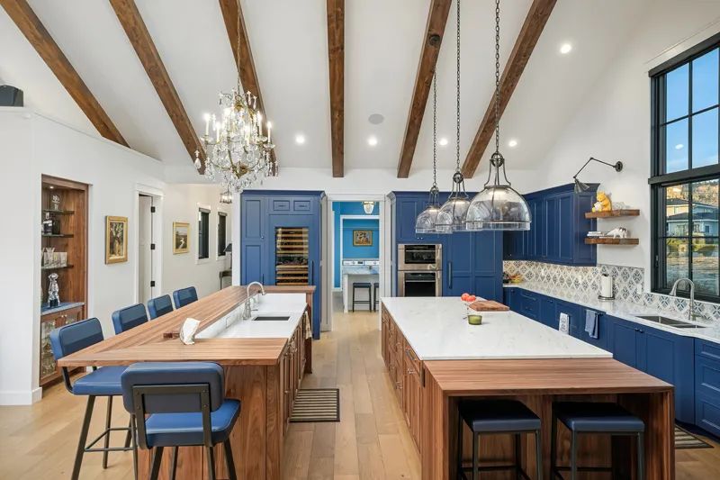 The living space features high ceilings with eight-inch alder beams that bring warmth and charm to the open space. The wood flooring throughout the living and kitchen area is an oak flooring laminate, uniquely built with wider, 8-inch planks, not only reducing sound but also for easy care.