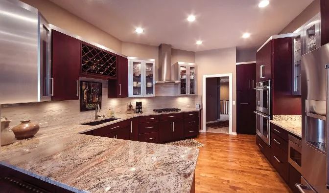 Granite countertops grace the space with earthy color variations of creams and deep browns. A subtle motion of red hue reflects the sangria-stained cabinets. “The granite is not so terribly busy,” comments Marilyn.