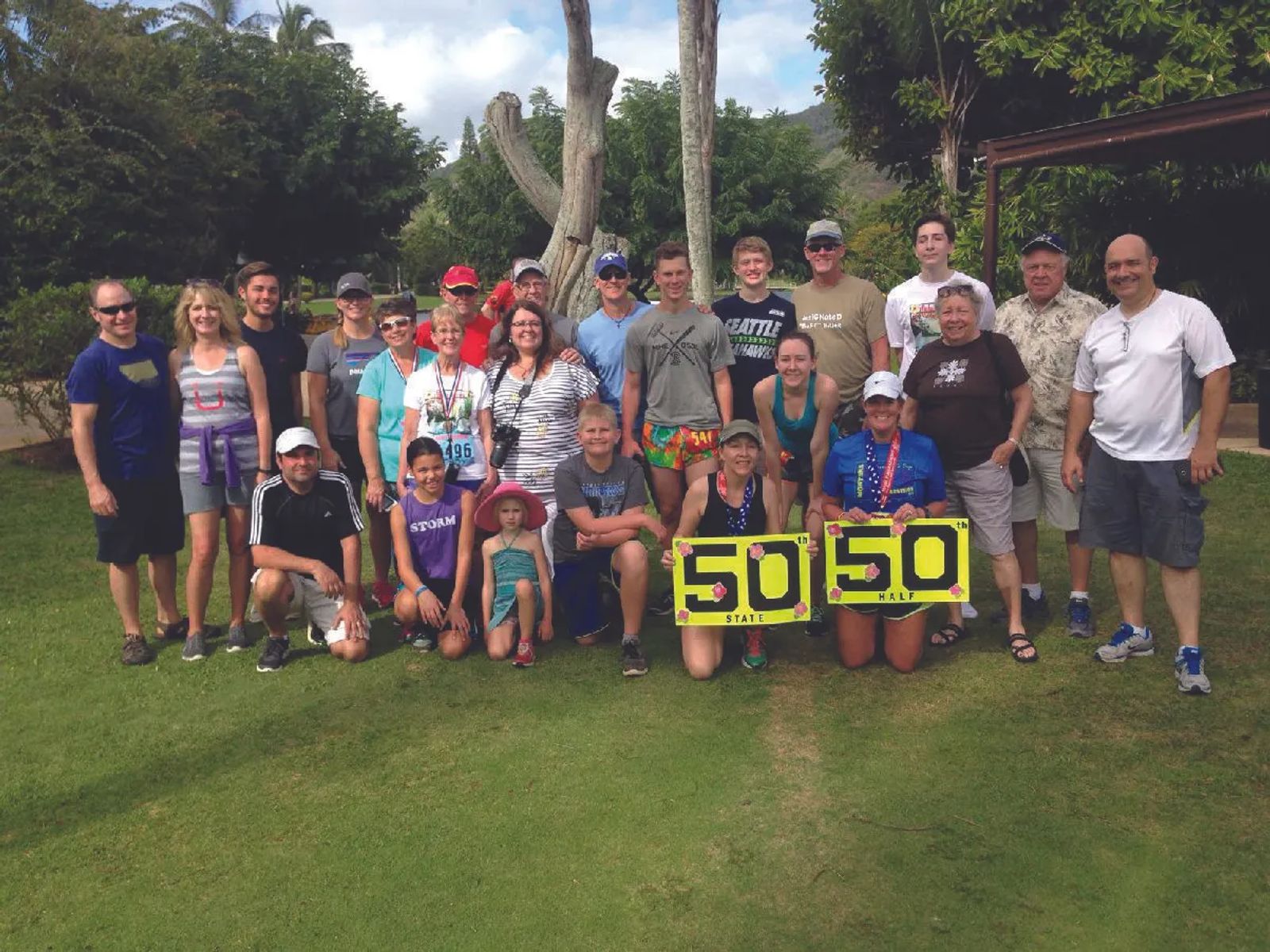 When Denise Lampi-Kok crossed the finish line at Hawaii’s Aloha Series Half-Marathon on the island of Kauai, she wrapped up much more than a 13.1-mile race. With the crowd cheering, electricity in the air and her ‘glam rock hair band’ music pumping through her ear buds, this race capped a decade-long journey, hopscotching across the nation. On January 19th of this year, just three days after her milestone 50th birthday, she ran her 50th half-marathon in the 50th state of the union. She did it with cheers from her family and with her best friend from college by her side.