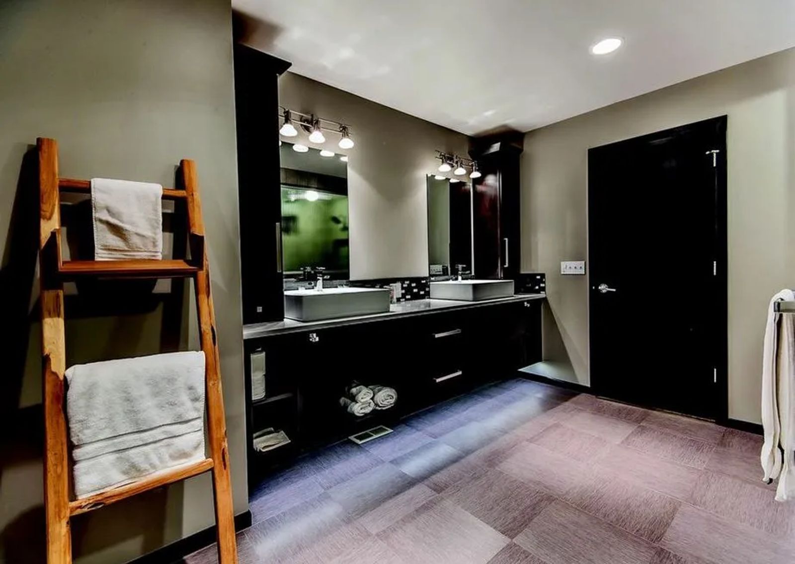 An “awesome” vessel sink with an open-storage vanity in this smaller bathroom makes as bold as statement as in the master suite. The shower shares the master’s slate-looking porcelain tile, but, in a slightly different color. The flooring is also luxury vinyl in a darker ‘Cocoa’ color.