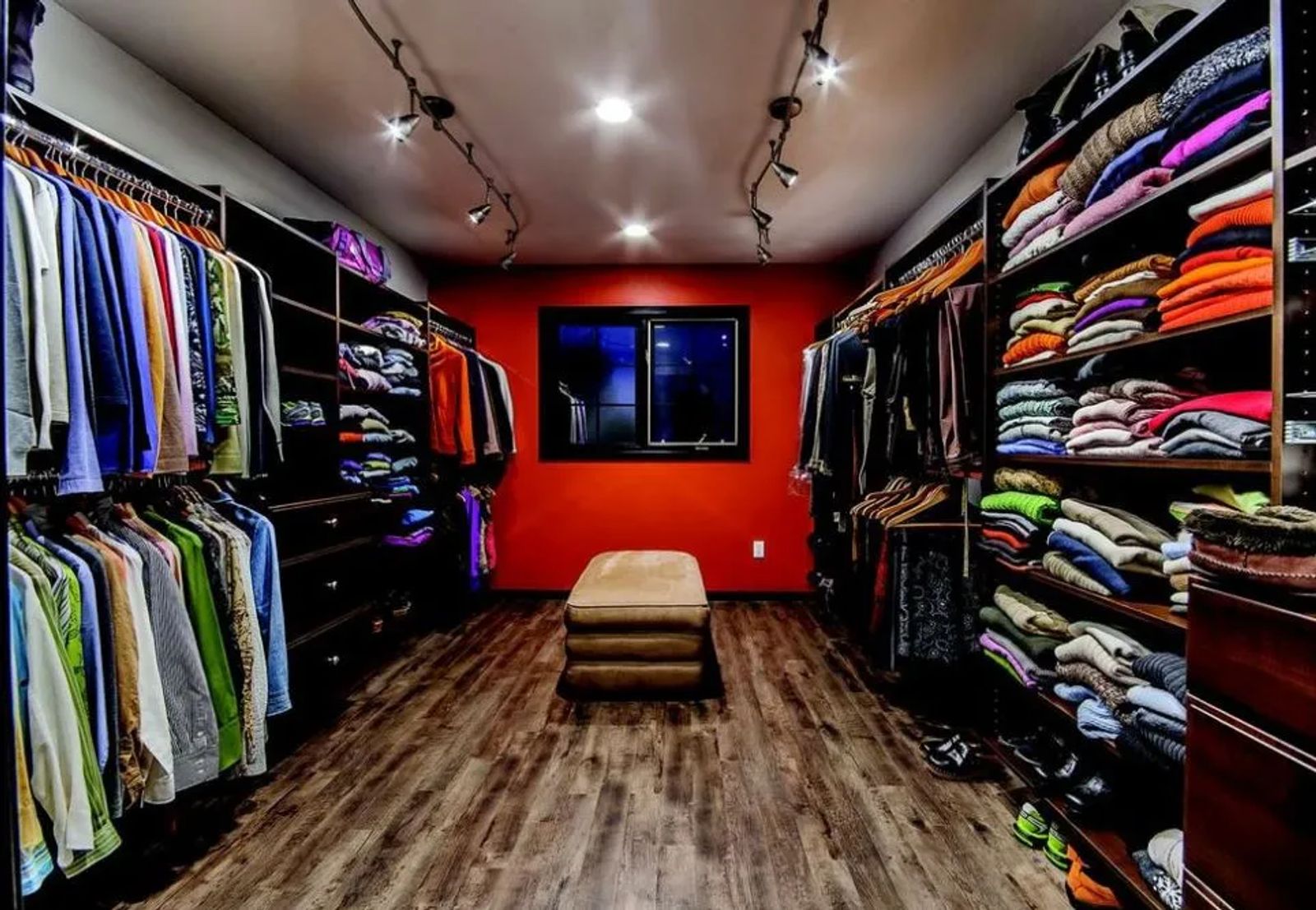 An accent wall painted with Sherwin Williams’, Jalapeño, expresses this savvy homeowner’s personality with its energetic hues of orange and red. “It’s definitely her color,” remarks Candi, as we note several of her clothing items that match this lively shade. A luxury vinyl floor in a ‘Saddle’ color lends extra warmth to the room as much as it completes the classiness to a closet any woman would appreciate.