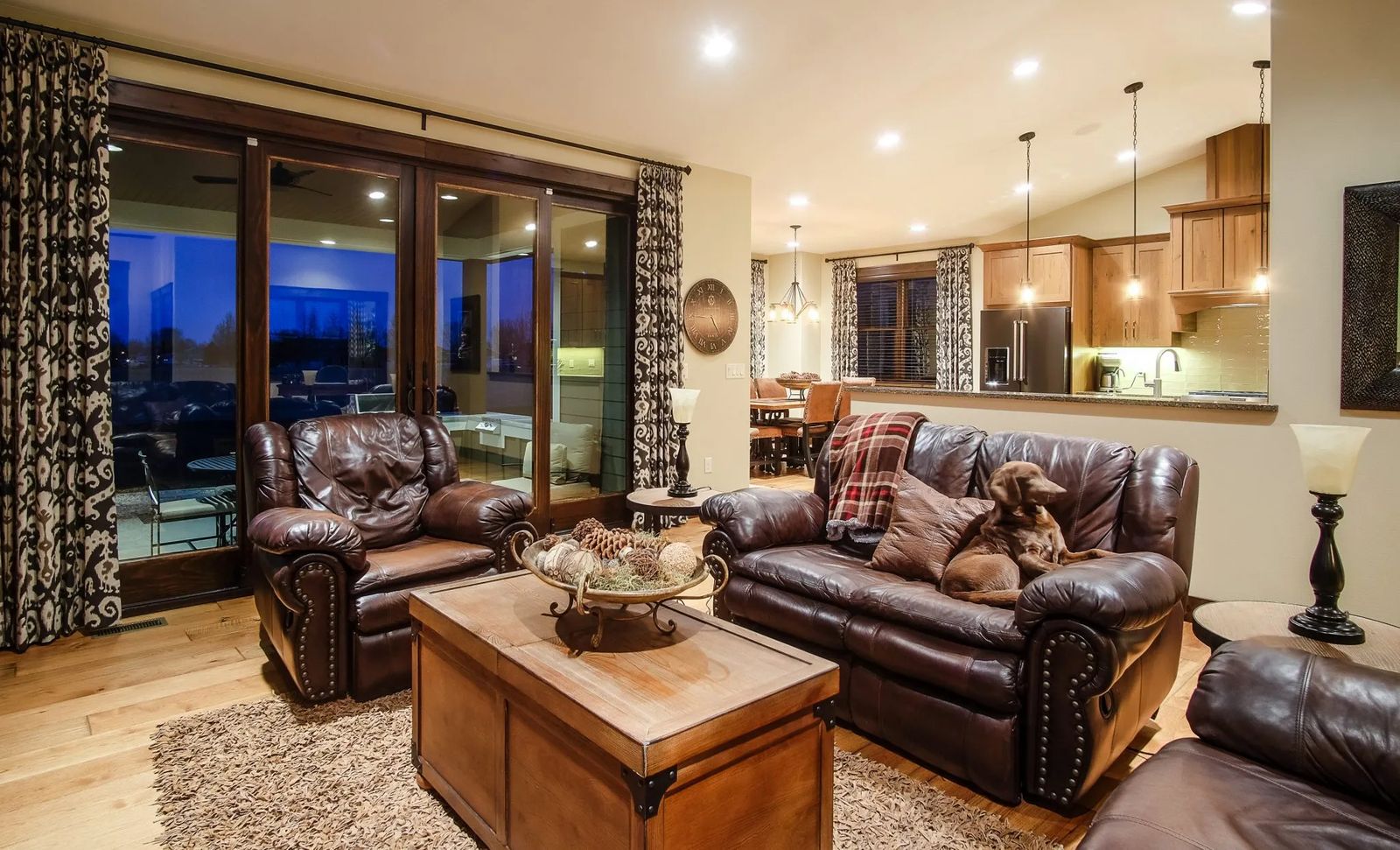 In the great room, high cathedral ceilings deliver bodacious beauty while vanilla-colored walls (Urban Putty, Sherwin Williams paint) draw the space together. Dark alder trim gives a dramatic contrast. Eye-catching IKAT-patterned custom draperies from Davidson Home Furnishings & Design LTD. complete the well-constructed Anderson windows and double sliding wood doors that lead to the covered patio and outdoor kitchen.