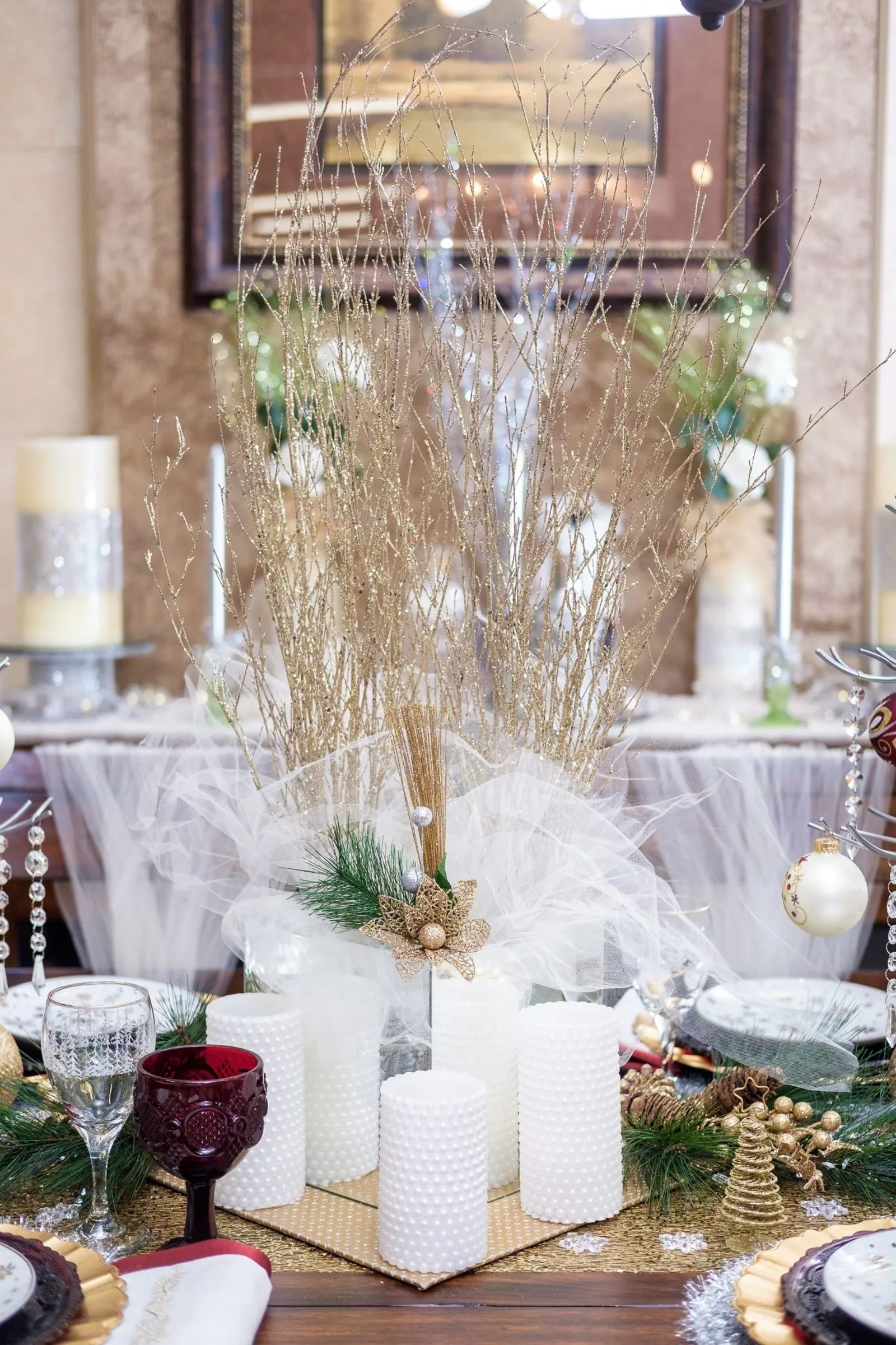 Alongside the silver trees is a set of gold spray-painted wine bottles. A band of gold ribbon wraps around the middle of each bottle, layered with a thin band of silver. The ever-impressive white poinsettia highlights the richness of each vase (wine bottle), as tall metallic feathers and sprigs sparkle beneath the glow of the chandelier.