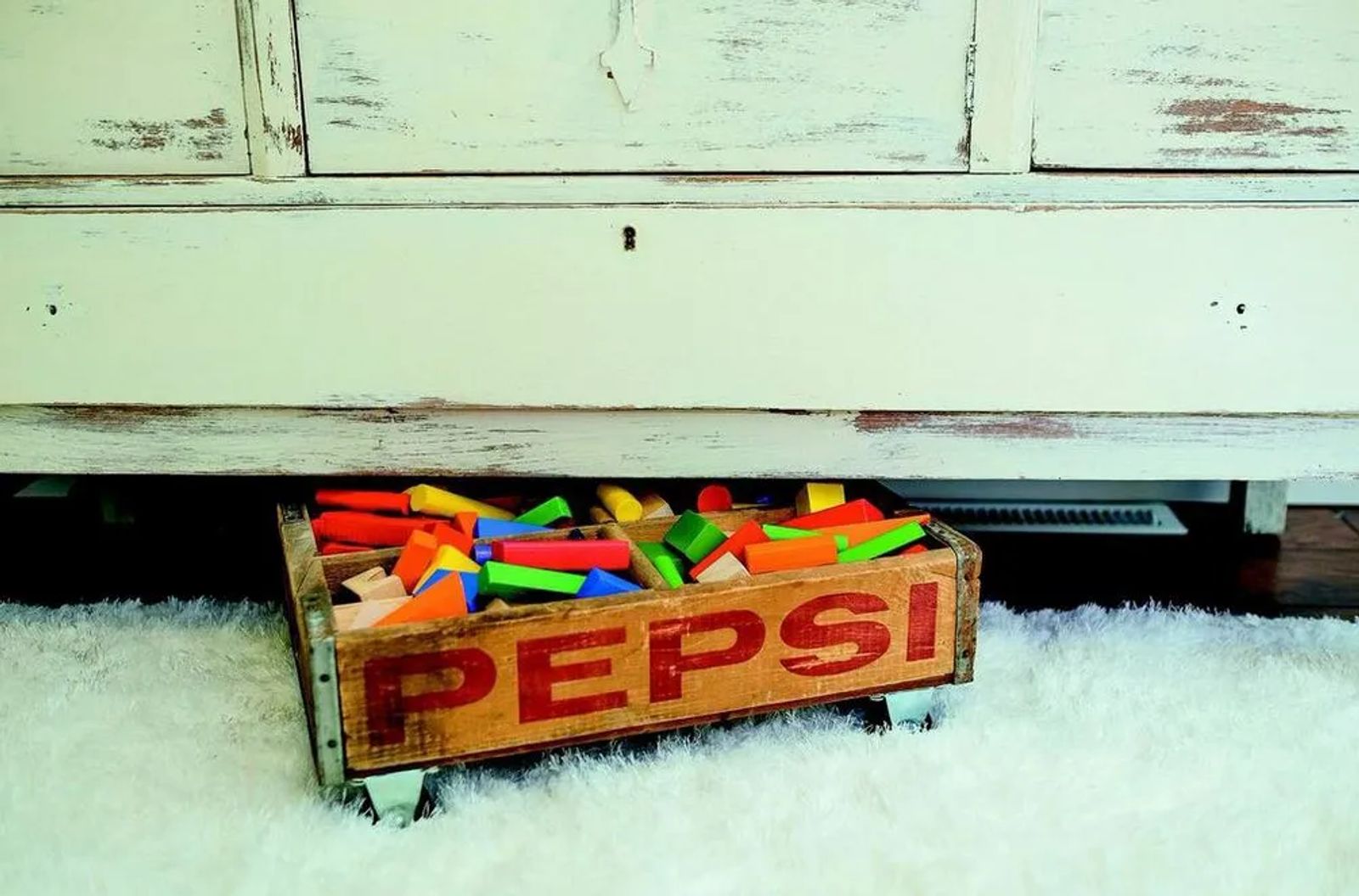 I loved the idea of using casters for this project. I ended up buying four more to attach to the bottom of an old Pepsi crate I had in the attic. The crate had dividers in it and so I cut some rubber liner to fit each section. By placing the liner inside, small items won’t slip through the cracks of the crate. These dividers can now hold blocks, small toys, or any other small items I might want to store. This piece would be great for a sewing, craft or even utility room.