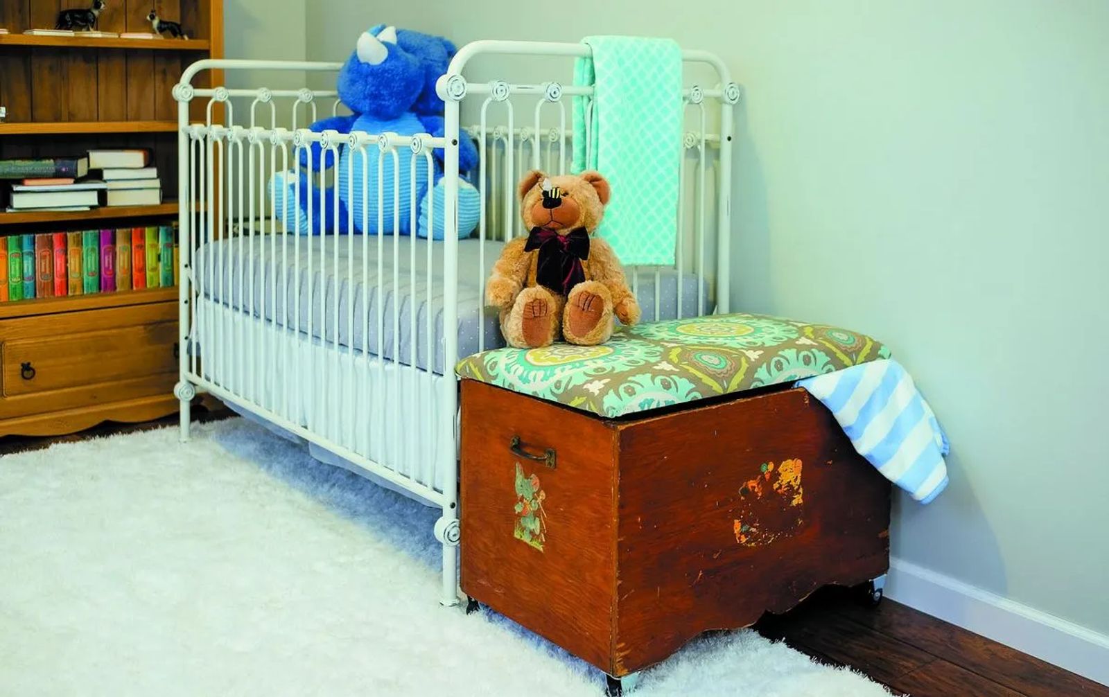 With a grandbaby on the way in the Jennings family, my latest project revolved around helping my daughter come up with storage solutions for her soon-to-be nursery. Whatever we chose had to be sturdy, moveable, safe and serve multiple purposes. While I envisioned an old crate with a vintage logo on it, everything I found was way out of the budget. I knew I wanted a lid, wheels and something that was big enough to actually hold things. After hitting the antique stores in town, I came across this old toy box that came complete with vintage bears painted on the side. It was perfect!