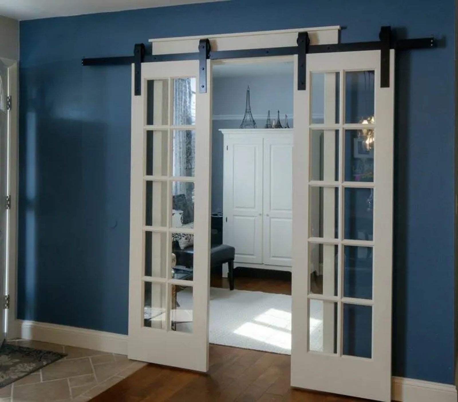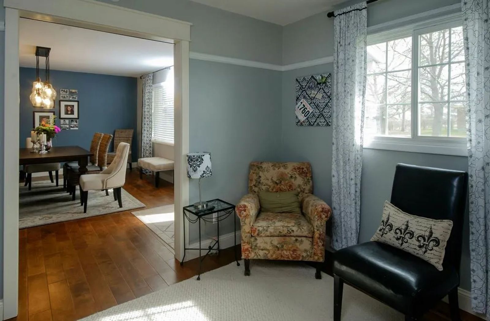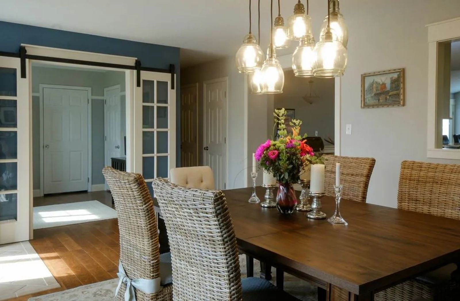 The recent renovation ended the small confines of choppy rooms. The front door now opens into a stylish dining area instead of the living room. Crisp gray walls light up the space. A warm ‘colonial’ blue accent wall defines white-trimmed French doors. The doors slide on a sturdy barn door track, leading into the office, formerly a bedroom. It creates a stunning visual.