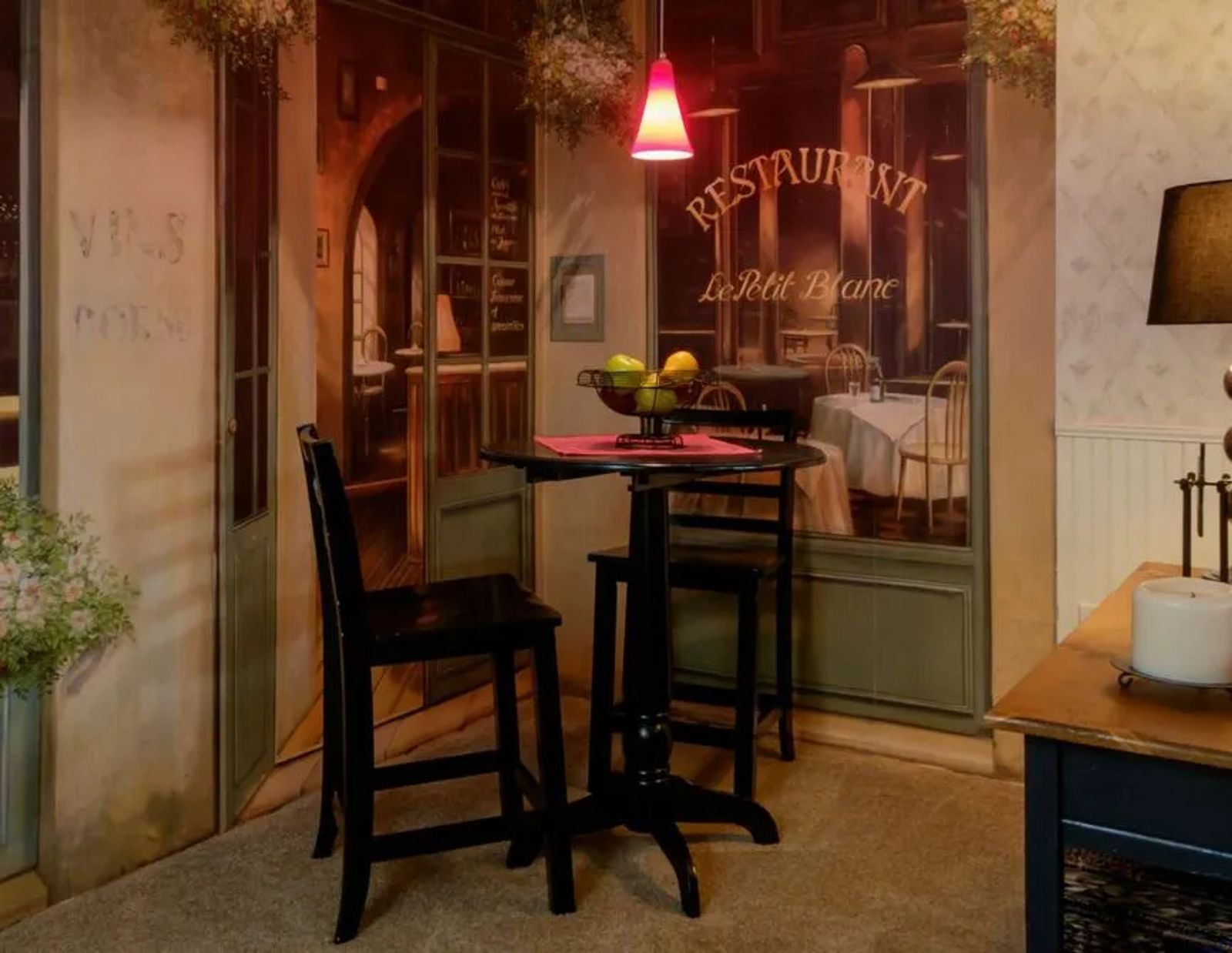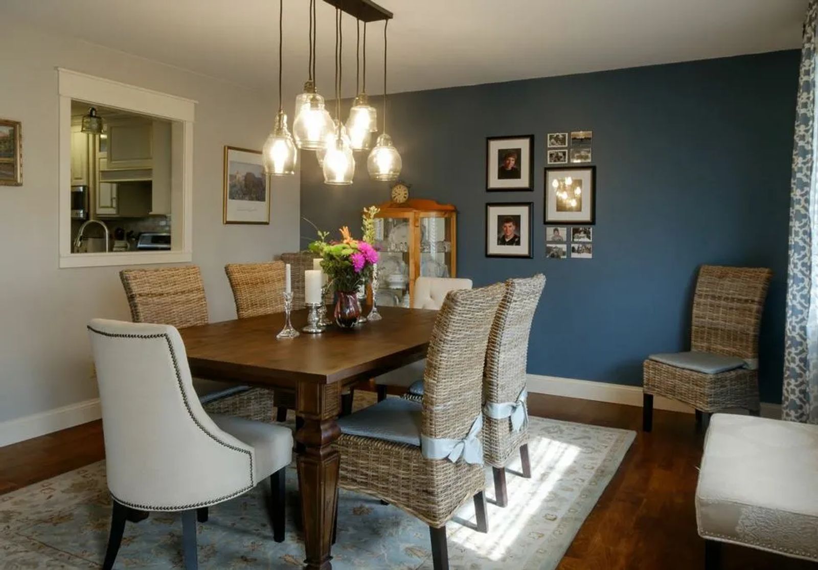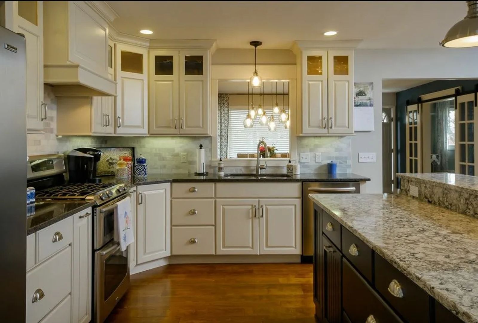 The recent renovation ended the small confines of choppy rooms. The front door now opens into a stylish dining area instead of the living room. Crisp gray walls light up the space. A warm ‘colonial’ blue accent wall defines white-trimmed French doors. The doors slide on a sturdy barn door track, leading into the office, formerly a bedroom. It creates a stunning visual.