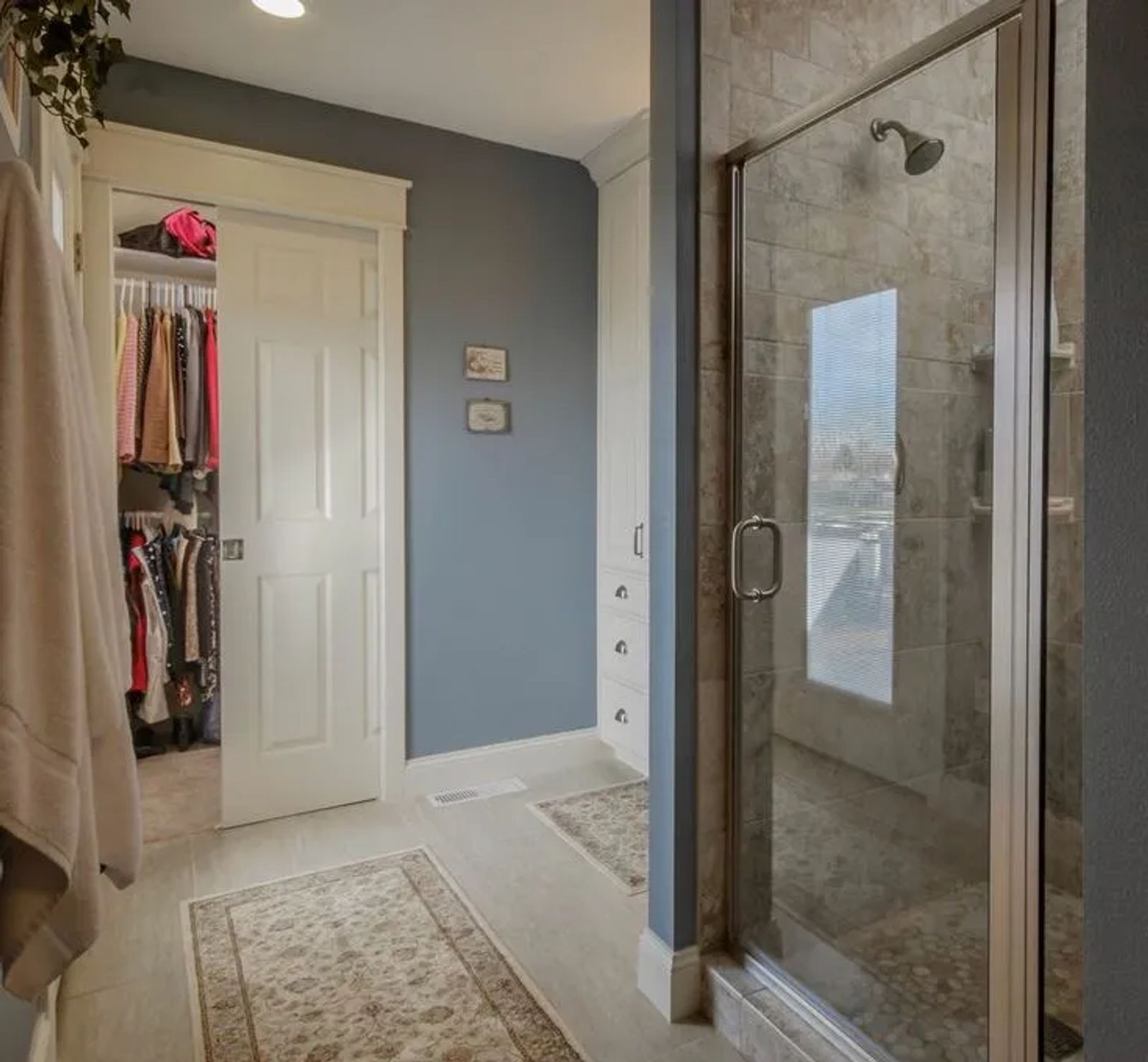 The addition includes a new mud room built on the north side of the great room. The couple’s dog, Ranger, enjoys hanging out here. An expanded bathroom featuring a walk-in closet and a walk-in shower graces the master suite. “The old shower was a teeny-tiny one,” says Janelle.