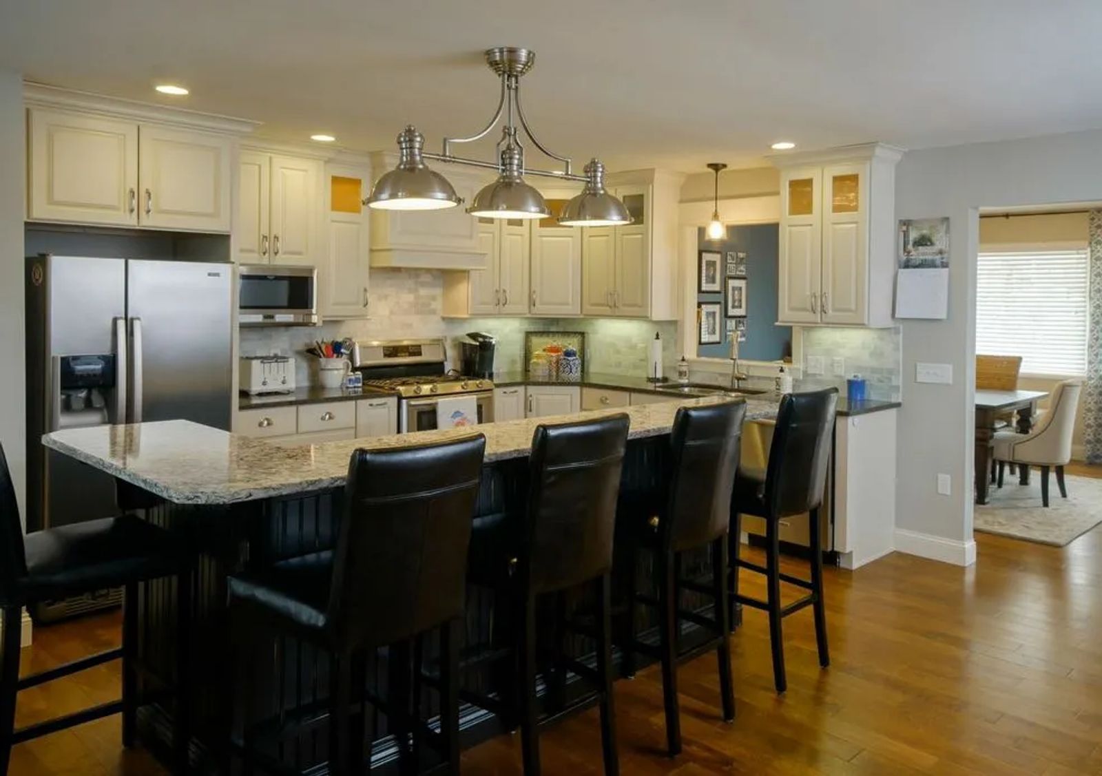The well-designed island cabinet offers practical solutions on top of being gorgeous. A pots and pans drawer had Janelle at "hello." The double garbage bin and an open end bookshelf finished the conversation. A brushed nickel light fixture hangs over the island reminiscent of a “school house” look. The silver tones fit right in with the stainless steel appliances, which appear softened by fresh cabinets.