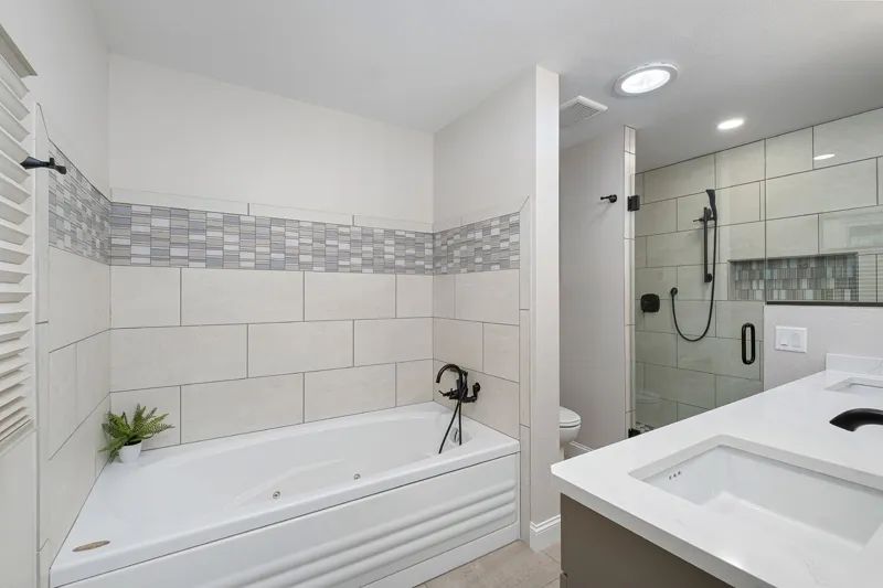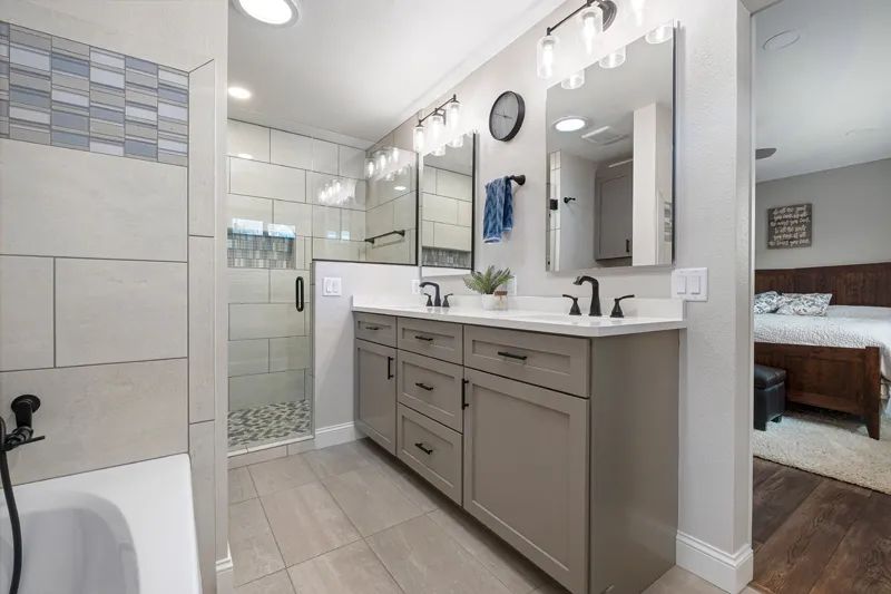 “We removed the shower from the big Jacuzzi tub here in the master bath,” Jeremy explains, “and built a huge walk-in shower with jets. We stole this shower space from the main bathroom. Plus, now they have a two-sink vanity.”