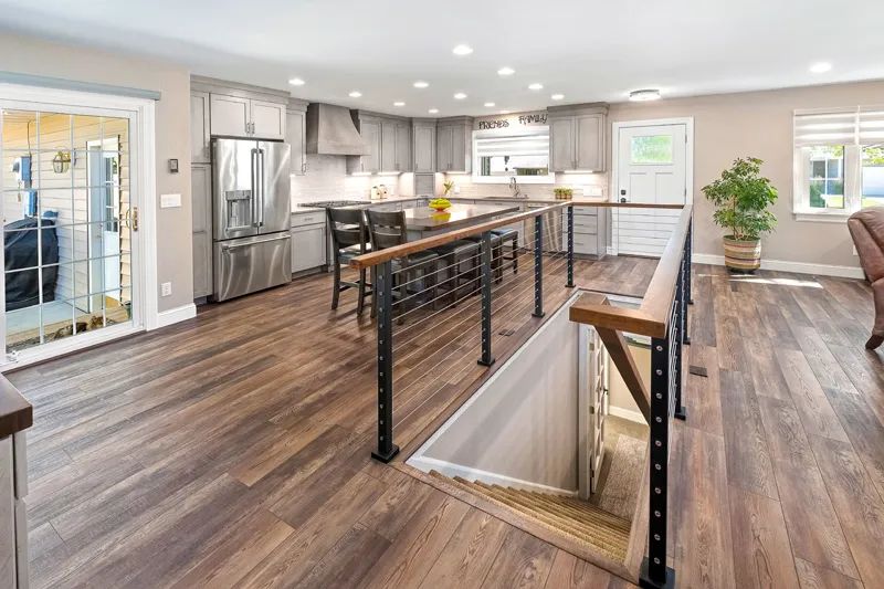 The home soon underwent a dramatic renovation. The outdated choppy layout blossomed into a transitional style open-concept design starting at the front door.
