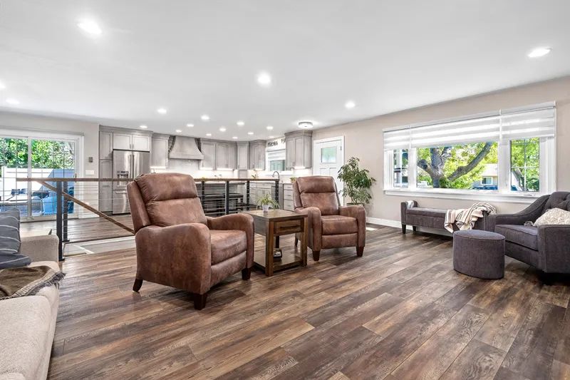 The entire living space is much more conducive to the couple’s lifestyle. Luxury Vinyl Plank flooring adds a further layer of classic design. “It features warm tones of deep rusts and some blacks,” says Kelly Erikson of Floors by Design. “It’s easy maintenance and doesn’t show paw prints.”