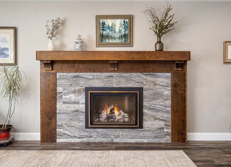 The wood tones of the stair railing pair nicely with the new fireplace mantle. “We made the mantle to give it character,” Angie says, “so it doesn’t look too traditional.” The luscious warmth of the wood accentuates the kitchen as well.