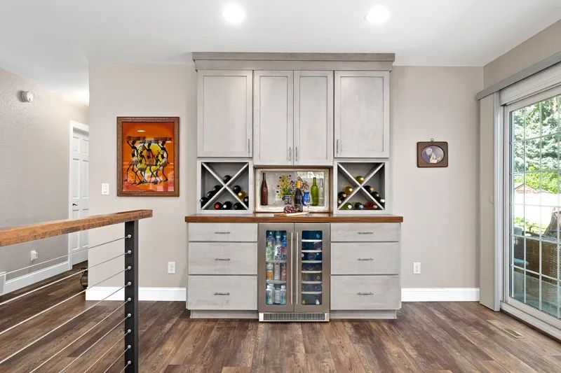 The stand-alone storage cabinet showcases the richly colored quartz top. Adding the final touch is a wine fridge. “I needed good storage,” says Joni. “Now I don’t have to drag stuff upstairs.”