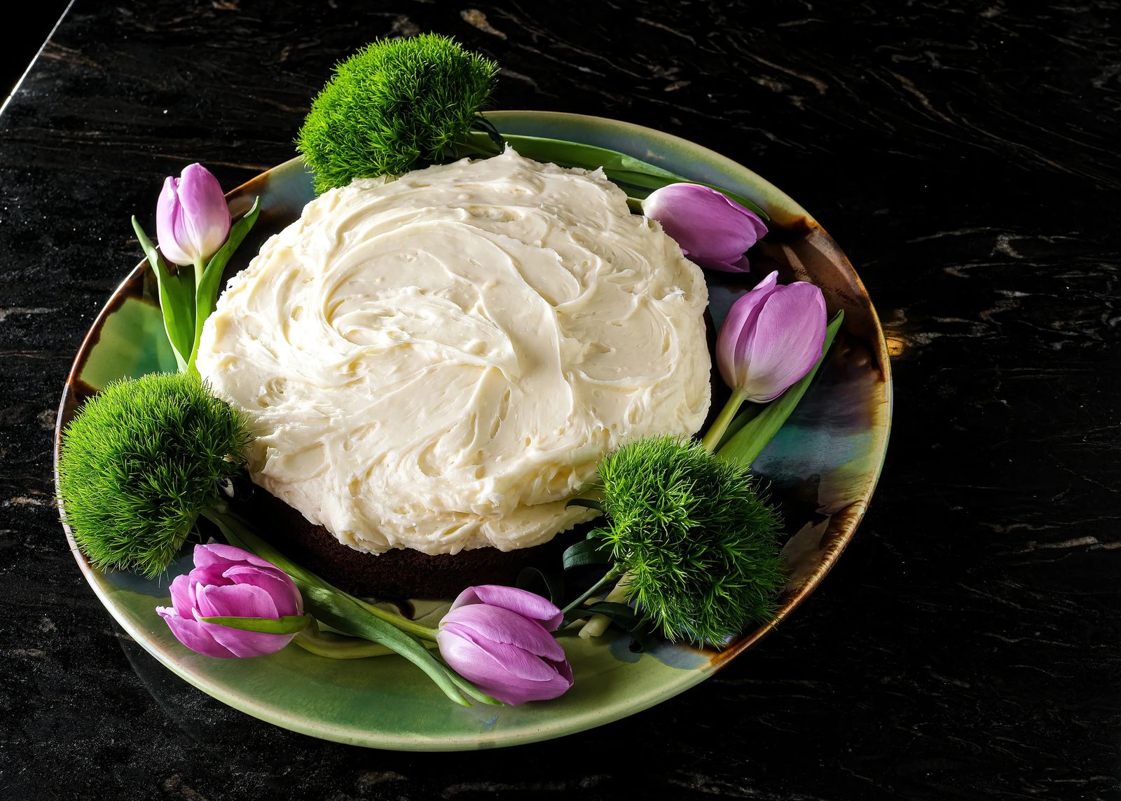 Let cake cool. Remove from pan and frost with cream cheese frosting, garnishing with fresh berries and edible flowers, if desired.