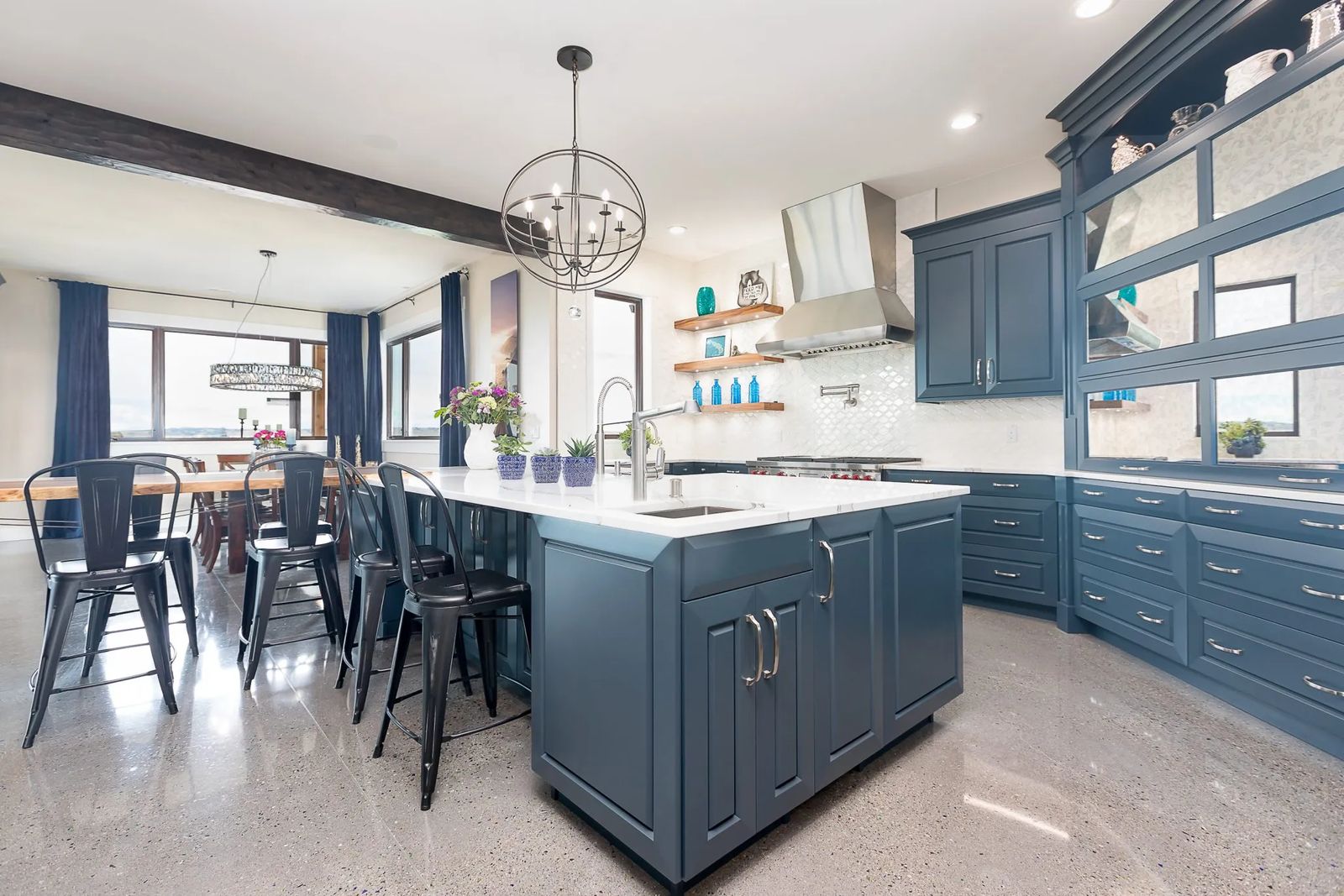 The kitchen’s dreamy cabinetry boasts coastal tranquility with its deep-blue color, visually balancing the light quartz countertops and center island. A built-in food drawer for Lexi and Lola, the couple’s Shih Tzu’s, tucks away on one side of the island when not in use. A stunning table or eating bar extends from the island in an L-shape.