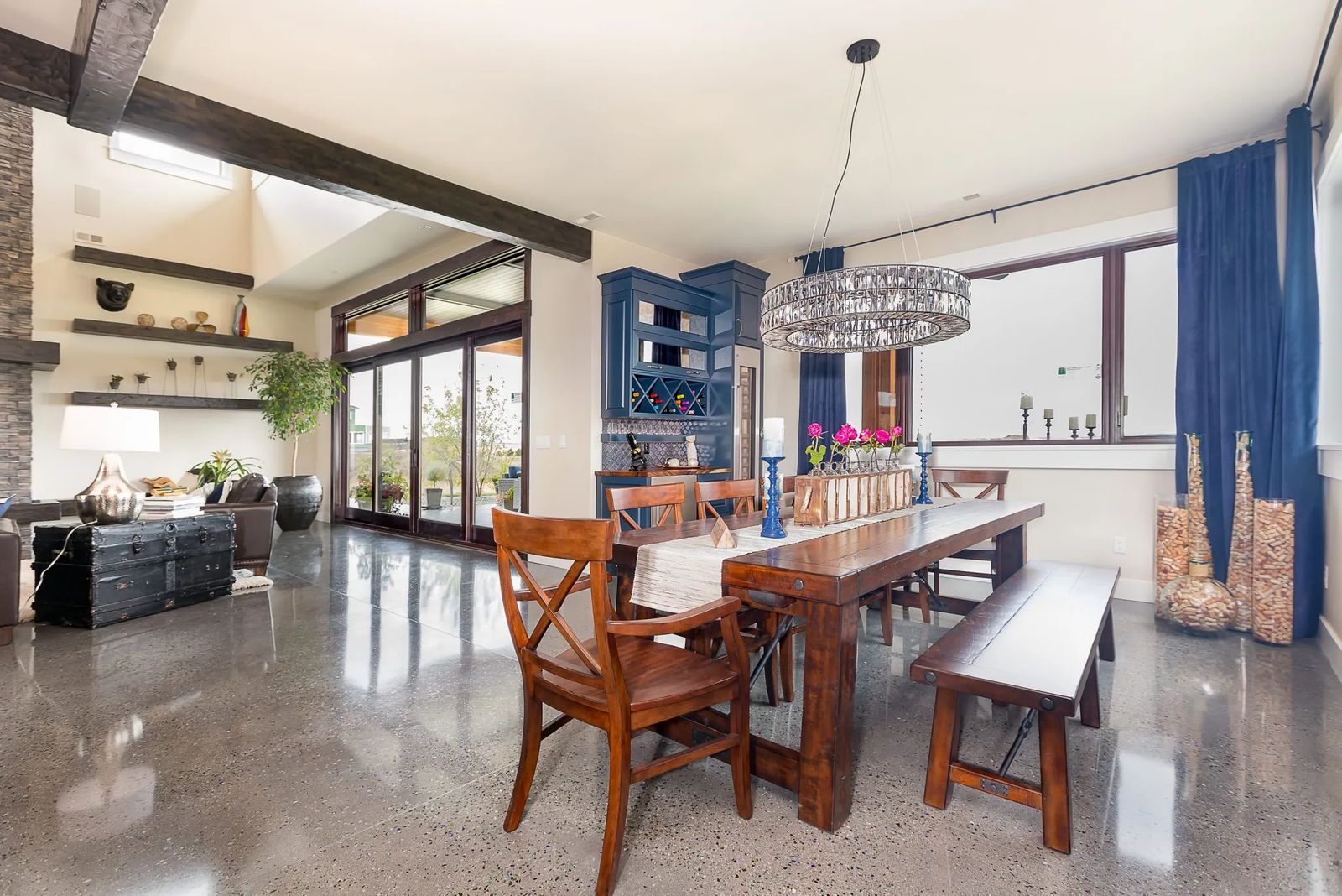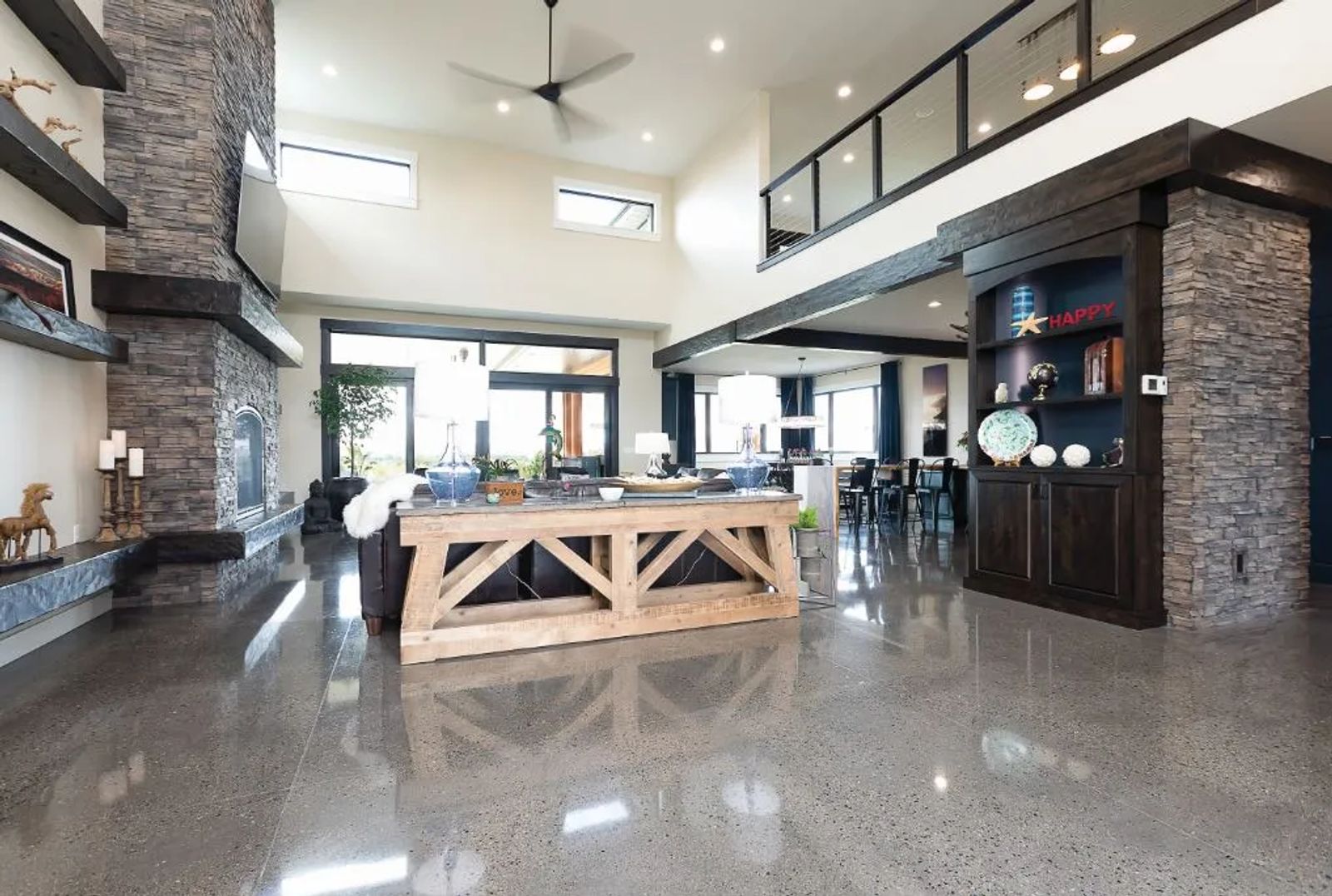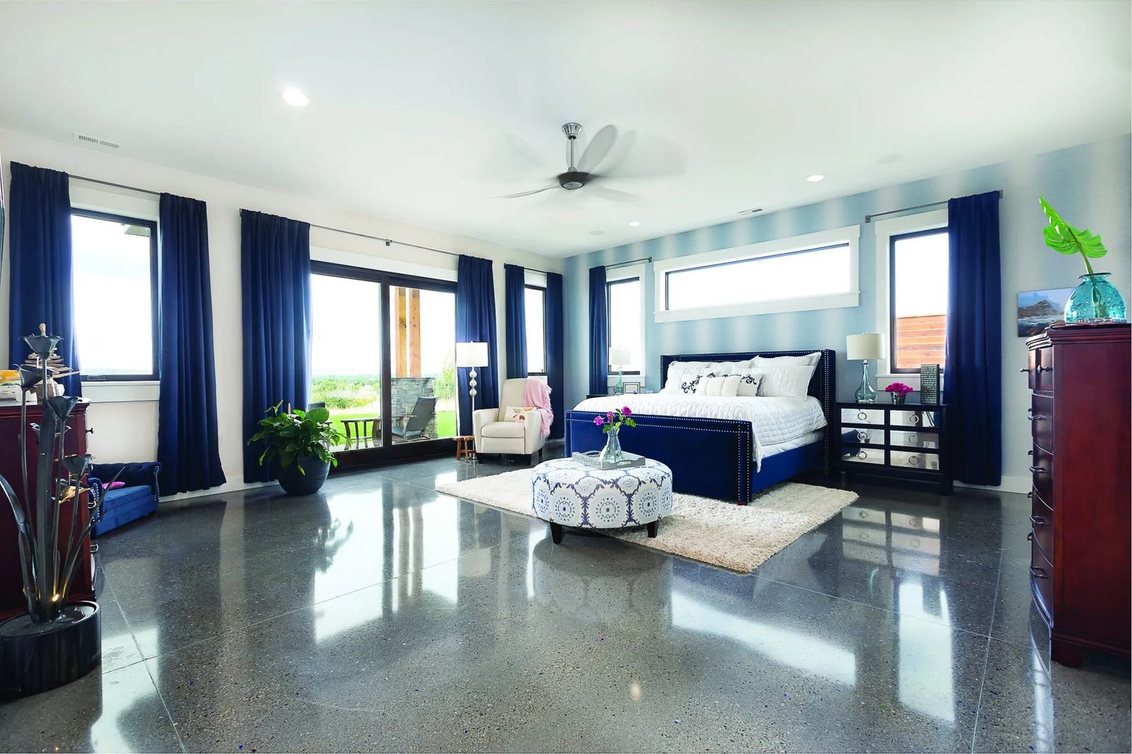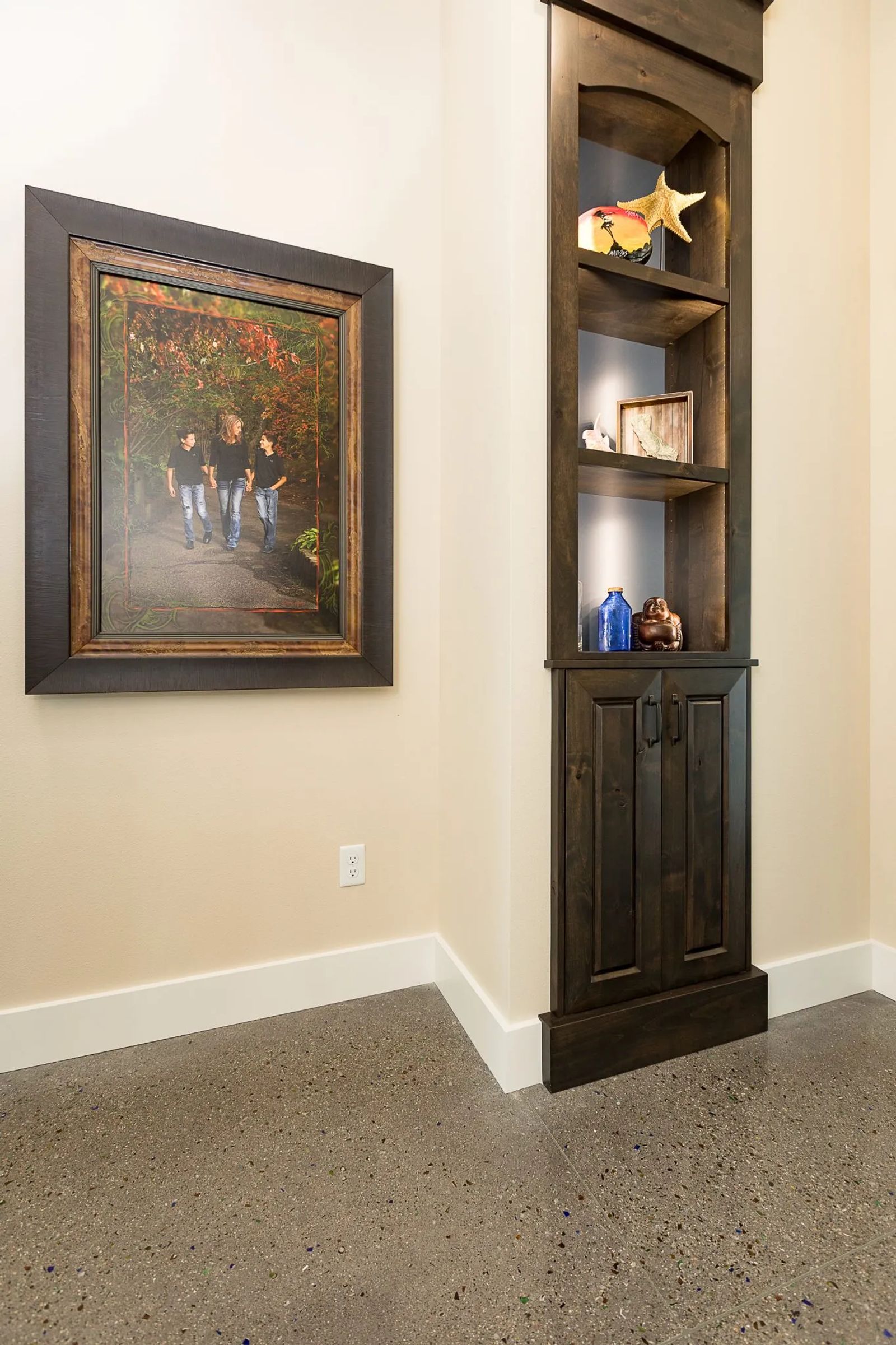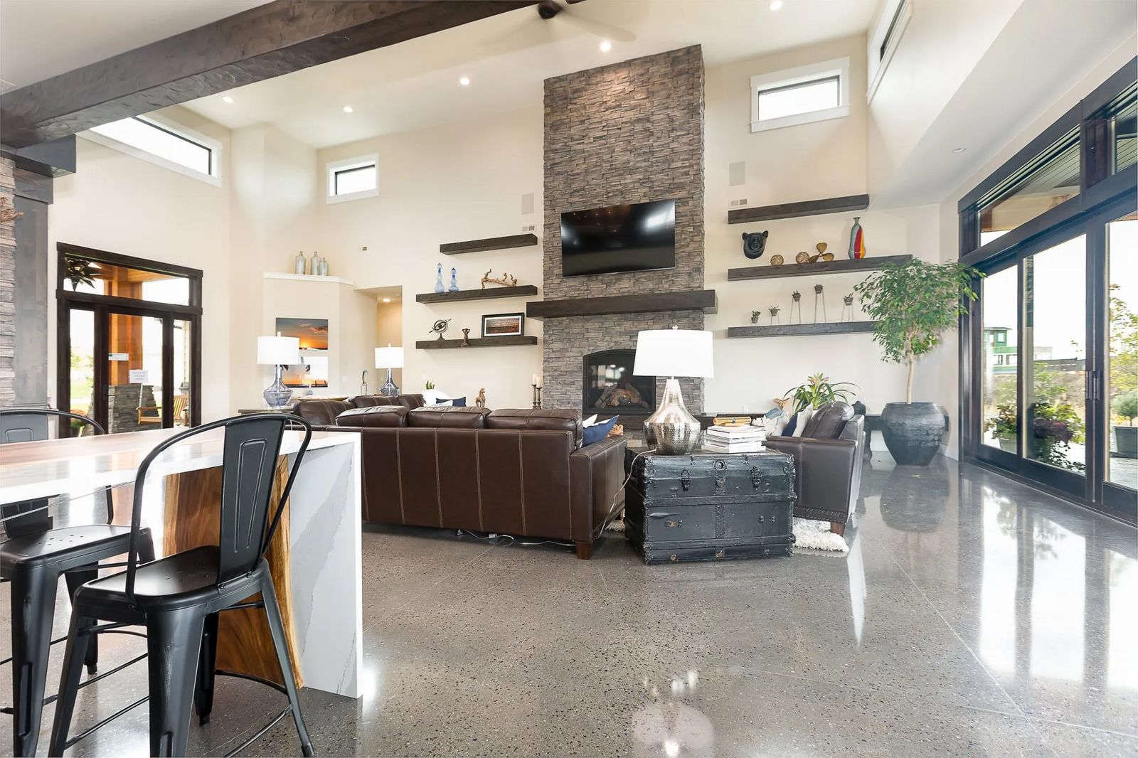 Large Infinity by Marvin fiberglass windows from Lynnrich usher natural light into the expansive space. The door and window trim finished with a charcoal stain from The Paint Center nicely “frames” the outdoor landscape. Heated concrete floors throughout the main level dance with color as natural light reflects recycled bits of embedded glass.