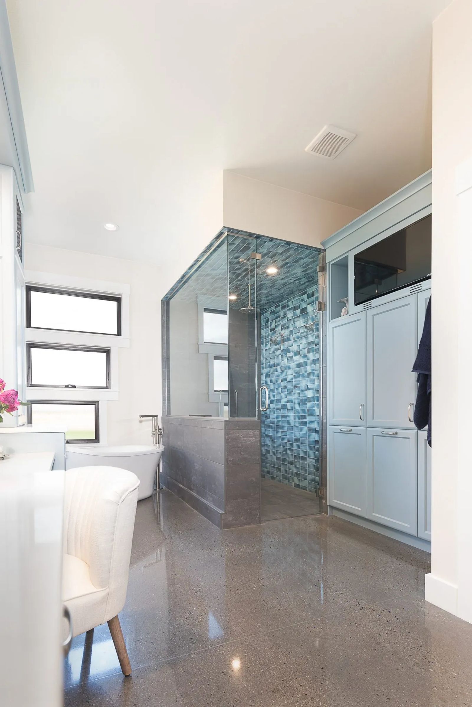 The en-suite is “spa-like” with a blue-tiled walk-in shower that “looks like a wave,” mentions Amy. No faucets are visible in the shower as a controller pre-set for the couple’s individual comforts commands four showerheads. A free-standing soaking tub bathes in the light of the staggered rectangular-shaped windows.