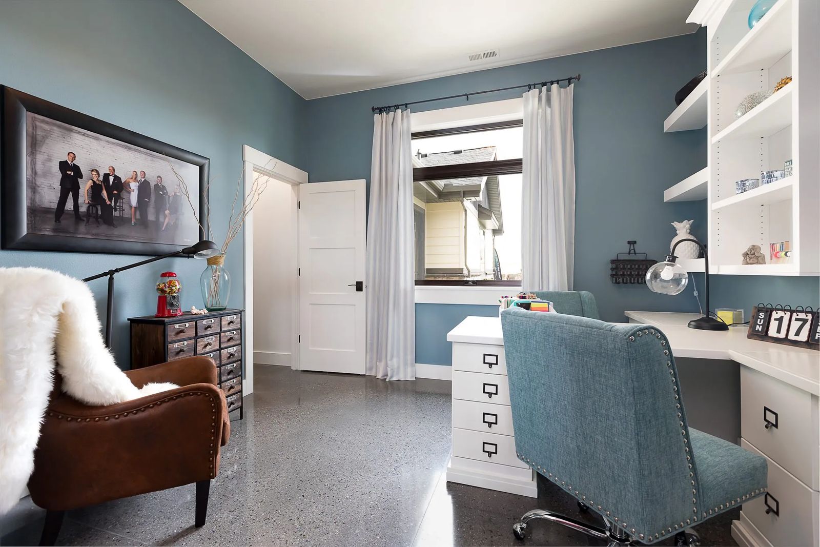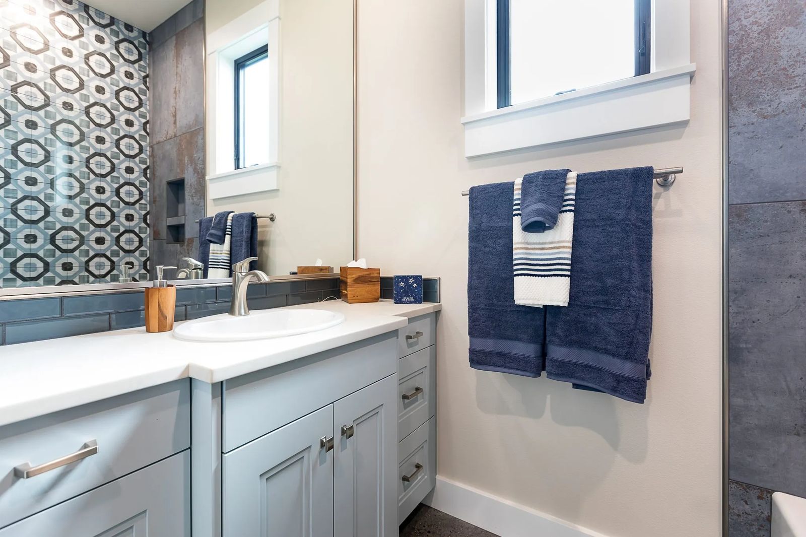 Opening into the family room, Amy’s color theme accented throughout the home pops with a navy blue felt-topped pool table. A floating bar made from the same wood as in the stairs fills one wall. Brilliant hues of blue and an array of other brightly-colored glass chips sparkle in the long polished concrete countertop from Magic City Granite. Underneath custom cabinets cater to savvy storage.