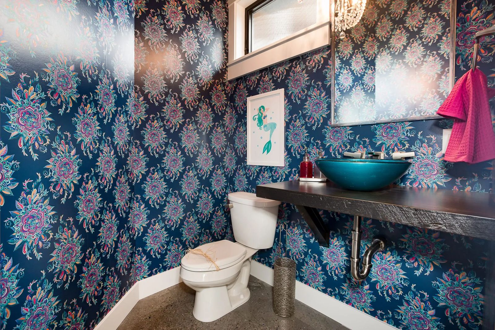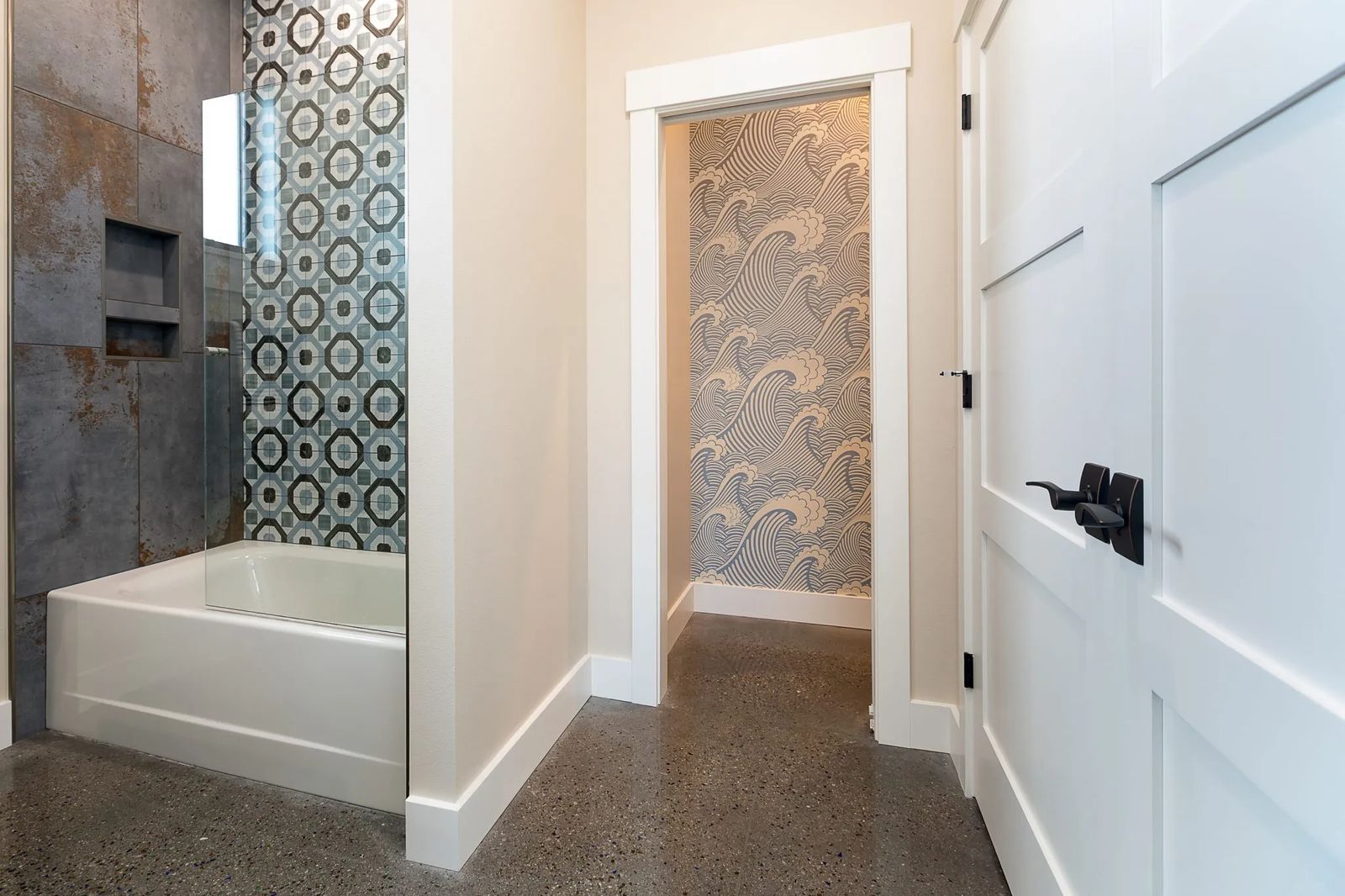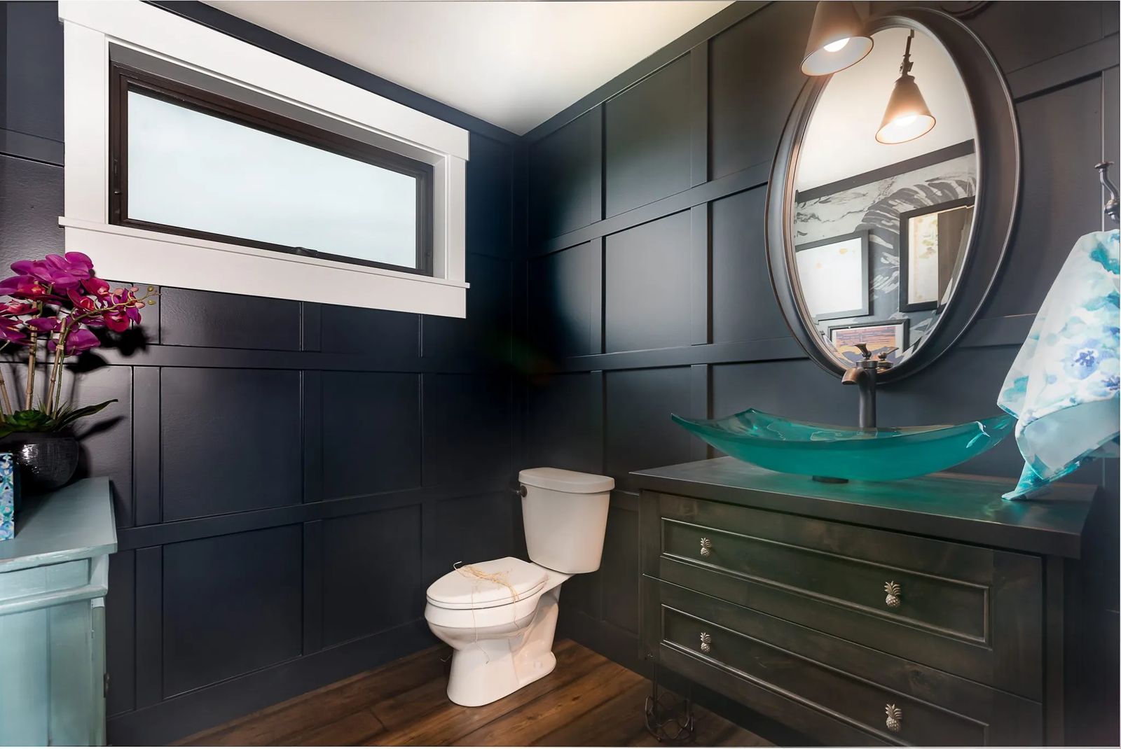 The homeowners are thrilled with every aspect of their new home. Their personality and style shine and Amy’s gift for decorating spices it up. “I wanted every bedroom to have an en-suite as it’s nice to have privacy.” Each bedroom refreshes the soul. The two on the main floor share one wing, yet, each is distinctively styled with a mélange of gorgeous fabrics and decor. The baths radiate with show-stopping wallpaper, colored glass sinks, and chic vanities. Patterned tile in the showers laps up both romantic and practical intentions.