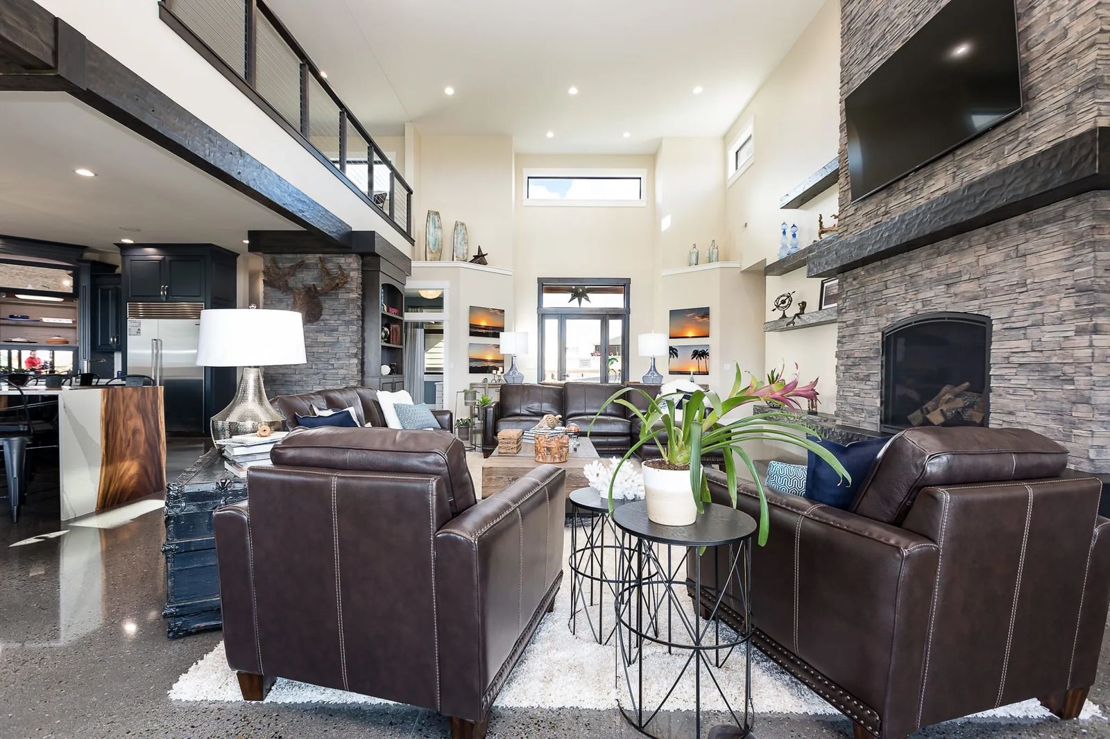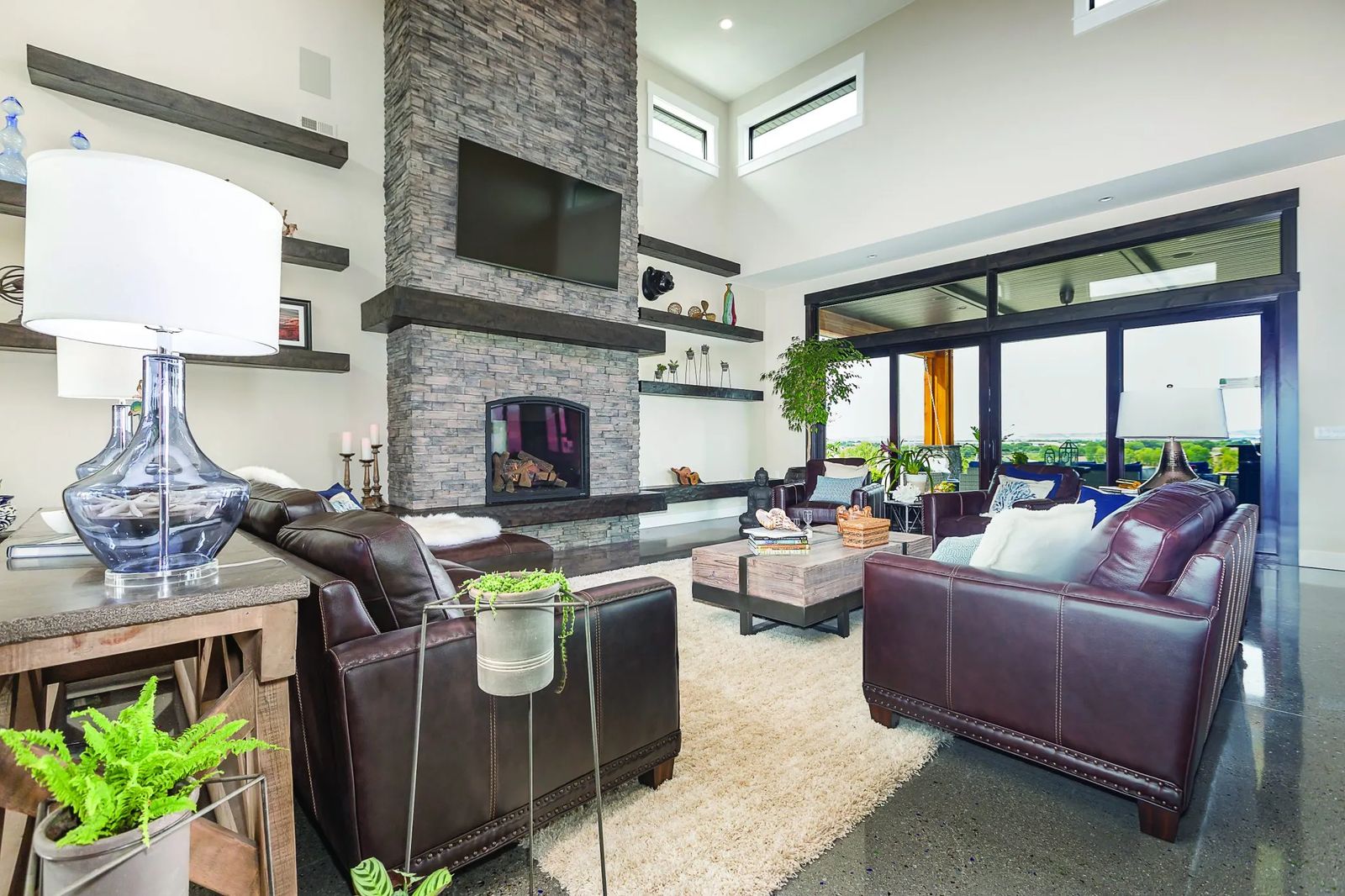 The cream-colored ceiling fuses with natural tan walls as a floor-to-ceiling stacked stone fireplace by Harper Masonry and Fireplace Center stretches upward twenty feet. The rich palette of textures and organic elements solidly anchor this feature as the uncontested focal point of the space.