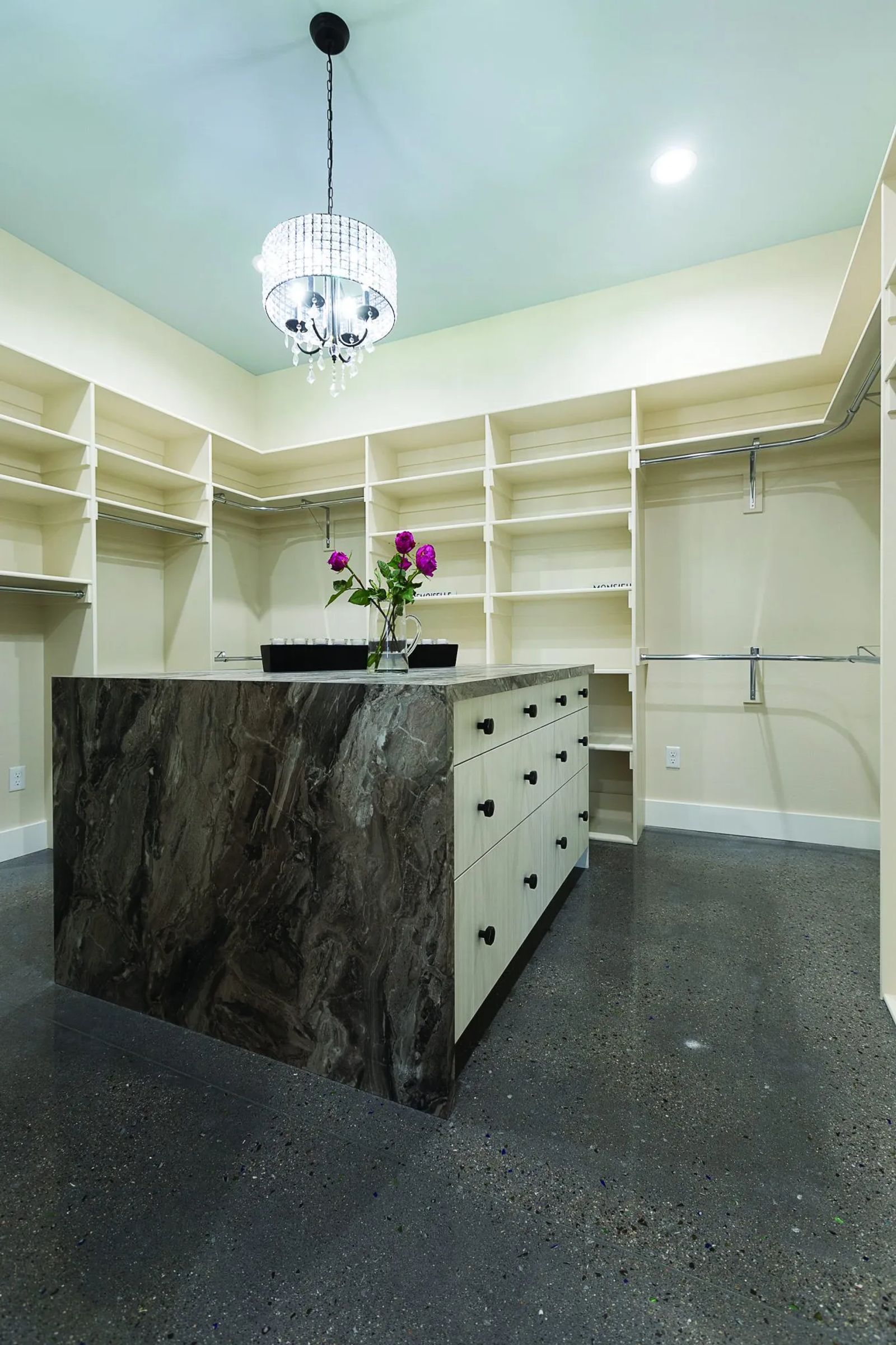A neutral palette of light-blue cabinetry soothes the mood. A makeup vanity creates an intimate effect while a built-in storage cabinet takes care of all the essentials. A walk-in closet with custom shelving and large island lends a luxurious lift, as well. Crystal knobs on the drawers highlight Amy’s side. A crystal chandelier hangs above while David’s side of the island sports masculine drawer pulls.
