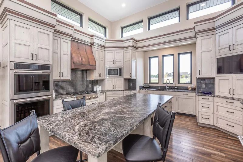 The kitchen is a masterpiece. Three transom windows sit tall above three vertical windows at the sink area. On either side, a built-in TV and microwave grace the space as do built-in appliance garages. A hidden walk-in pantry is concealed next to the fridge. Stainless steel JennAir appliances sit at this heart of the home.