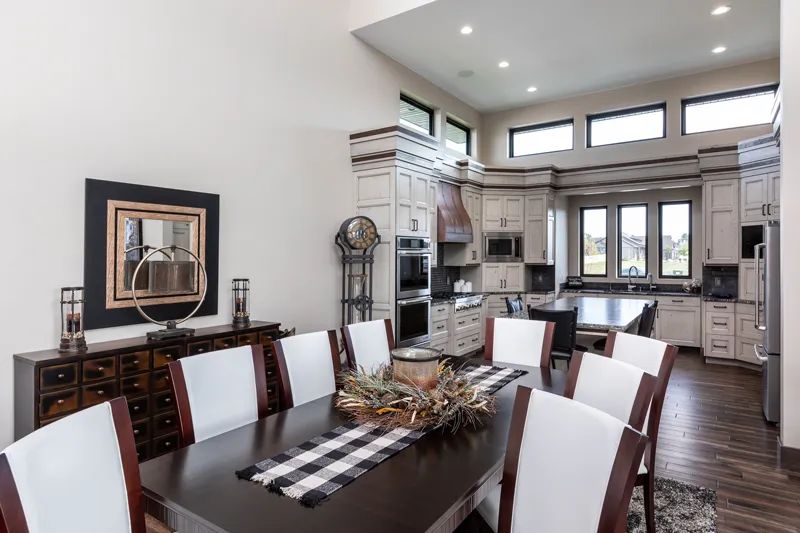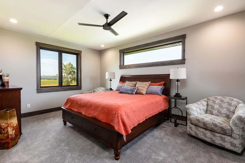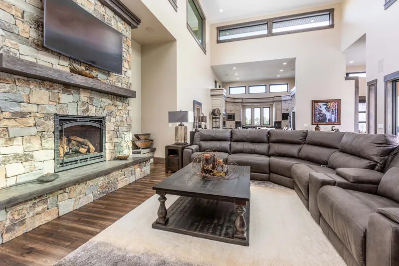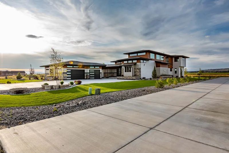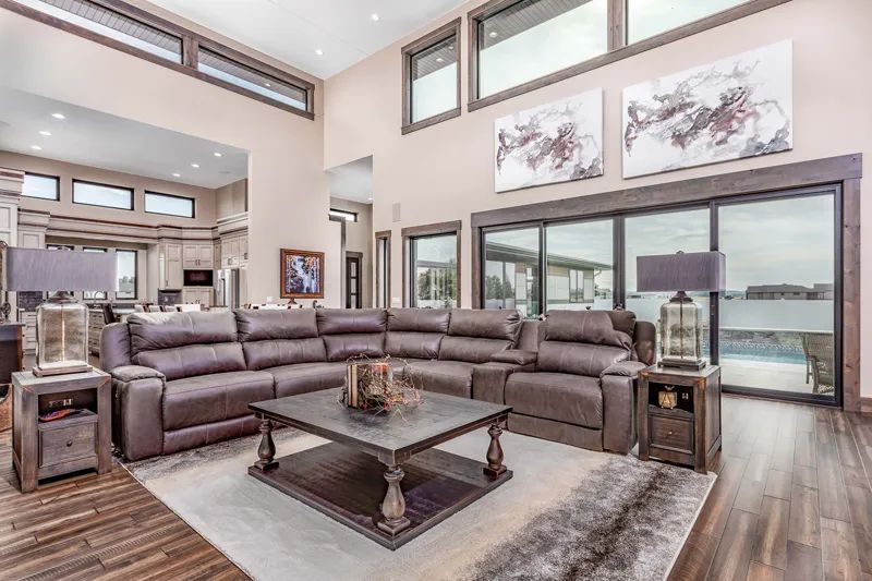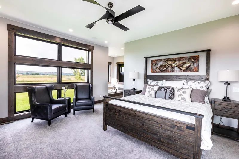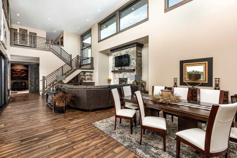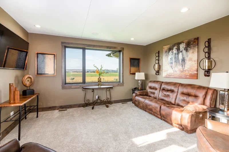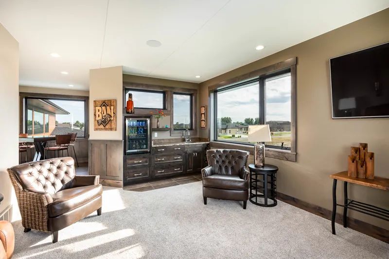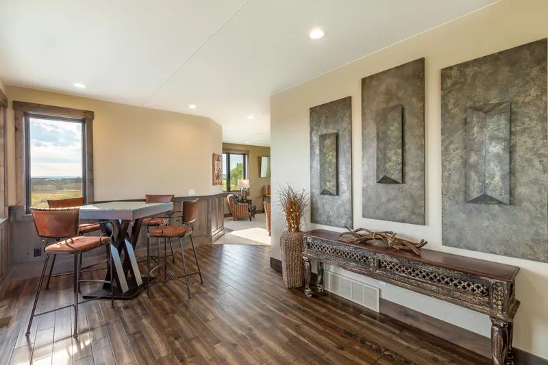 The exterior offers a mix of stone and siding in earthy tones, a hip roof (sloped inward toward the walls) with deep overhangs, and bands of windows, all hallmarks of that pristine prairie modern look. The rustic feel continues inside with an expansive, 5,000-square-foot open floor plan that offers a modern sensibility. The home’s power is serviced by Yellowstone Valley Electric Cooperative and it’s highlighted by 66 energy-efficient Pella windows. Sunshine pours in, creating a seamless transition from outside to in.