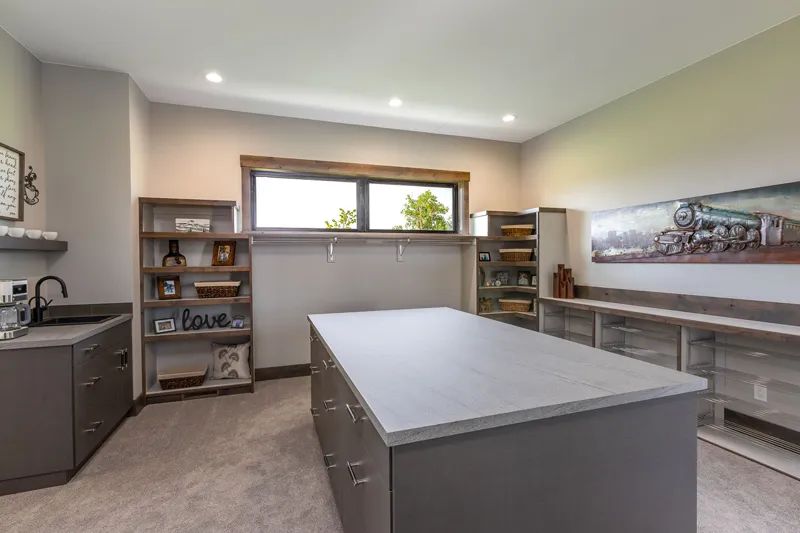 “The closet is a modern contemporary design,” acknowledges Tom Halton of Halton Homes. Tom and Tana agree the closet was built around the enormous island in the middle. “The laminate top resembles stone and it’s perfect for folding clothes,” adds Tana.