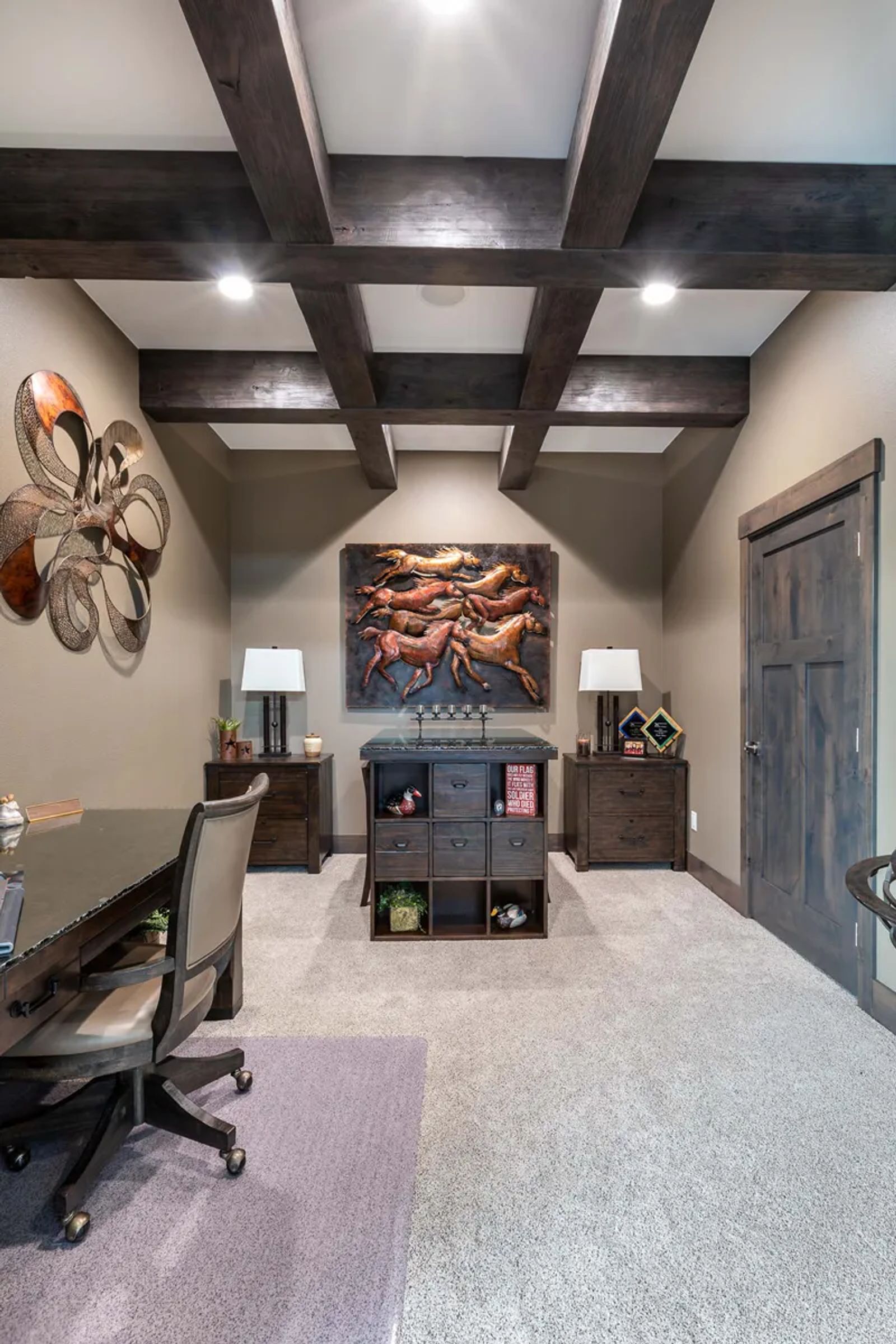 Below the loft sits the office. This distinctive chamber adds an old-world flavor. “I told Lance I wanted beams and barn doors,” says Tana.