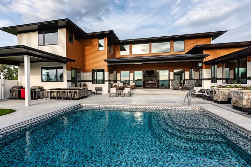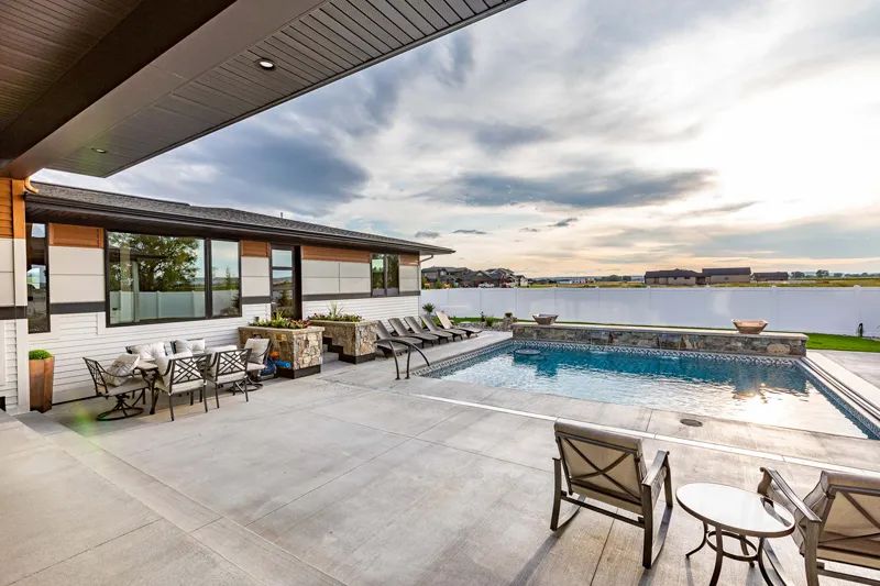 Oversized patio doors in the main living area provide light to this big space and also open up into the backyard oasis. “Our first Parade home had an interesting shape, so this time we went with a horseshoe shape,” Tana says. “We wanted a house centered around a pool.”