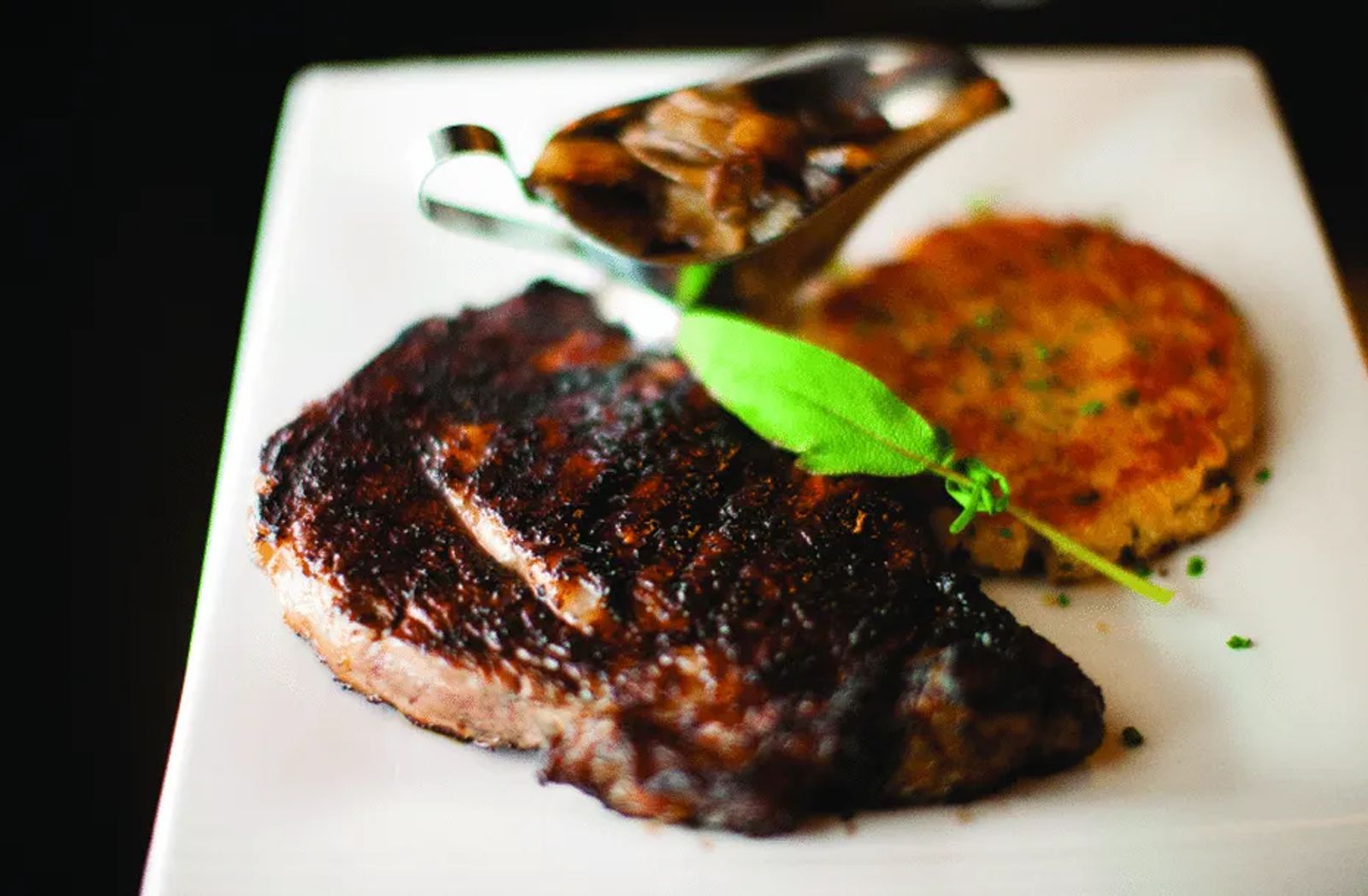 From the Menu: 16-ounce Ribeye with a Spicy Potato Cake, and Mushrooms and Onions