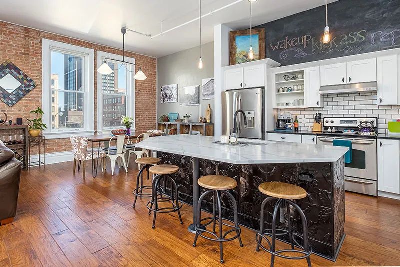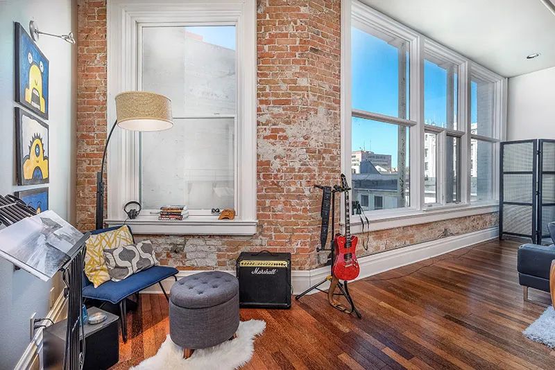 Original brick covers the walls from floor to the towering ceilings. It’s the perfect backdrop for the colossal white-trim windows. Wood flooring enriches the character of this vintage space.