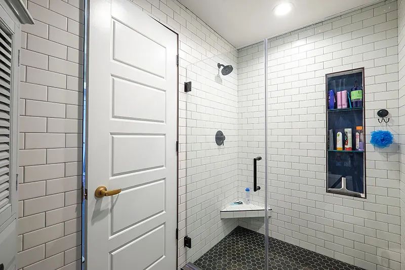 Black hardware on this luscious cabinetry delivers distinction to white quartz countertops. Gray linen-look tile flooring is the perfect partner to the white subway tiled walk-in shower.