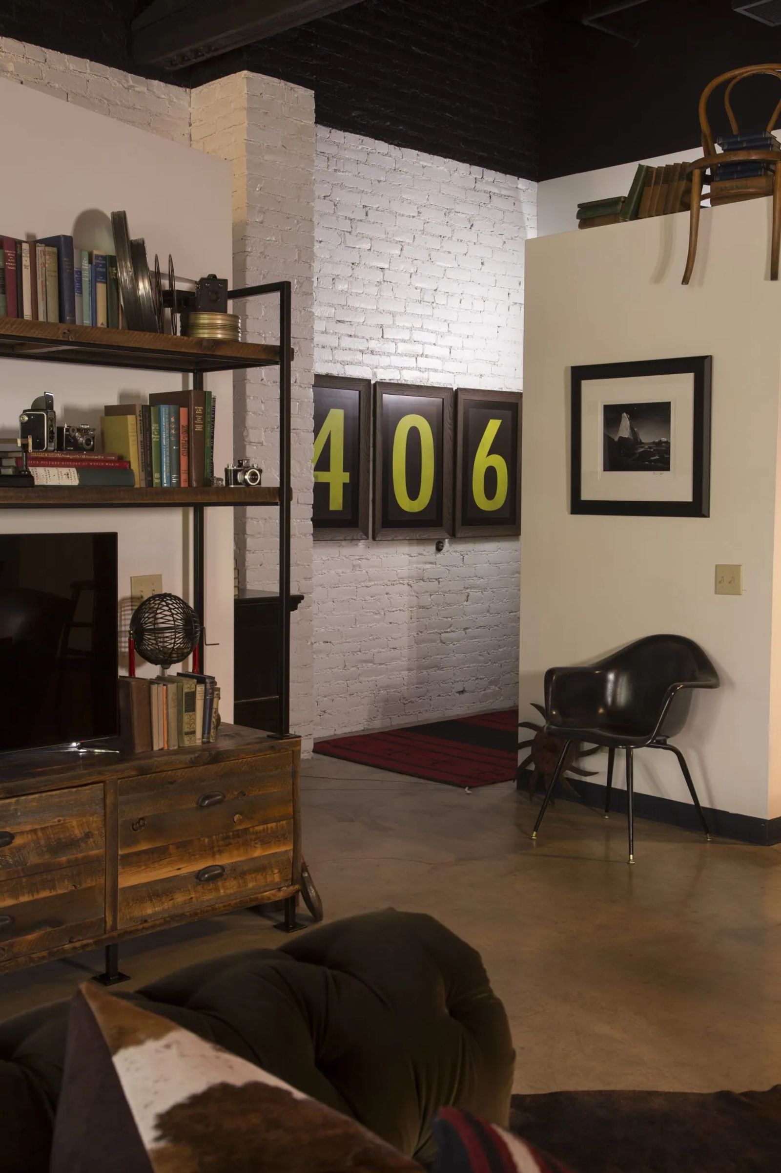 A large black-and-white photo of the Titanic’s propellers enhances the historical aspect of this vintage space, as do a few pieces of Western artist C.M. Russell. Colorful “Native Pop” art adorns the wall between the master bedroom and the bath, boldly intensifying the character and spirit prevalent in this loft apartment.