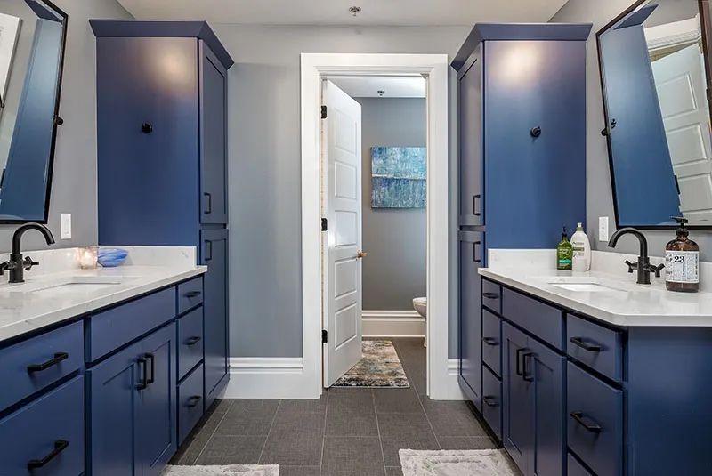 A recent bathroom remodel adds an extra dose of luxury. The couple revamped two separate half baths into one gorgeous space. Bob Pentecost Construction did the plumbing and electrical work while Cabinet Works crafted exquisite navy blue his-and-her cabinets.