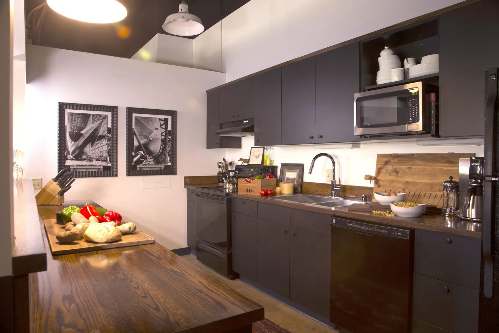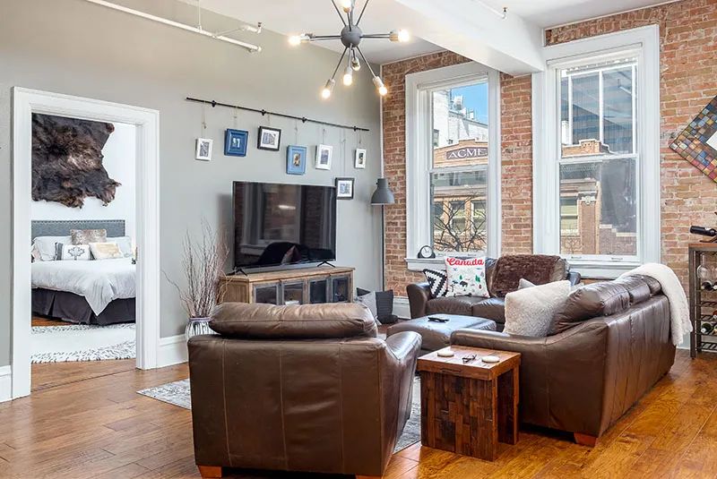 The 1,100-square-foot two-bedroom, one-bath apartment boasts a high wood beam ceiling painted black. Walls allocating private space look fresh in white coats of paint. Exposed brick surrounds the quarters, providing that special texture that defines this urban living space.