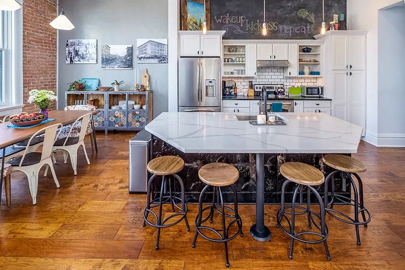 The couple also enjoys entertaining friends and family in their 1,500 square-foot loft. The open living concept provides a wide-open large living area complete with kitchen and dining space. “This living room area was a tea room at one time,” Julie says.