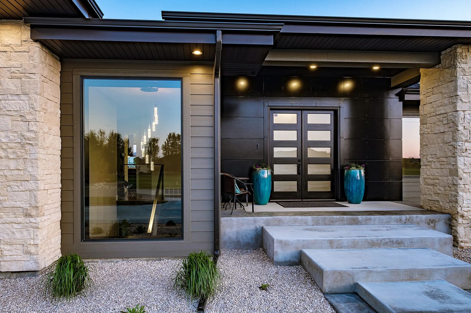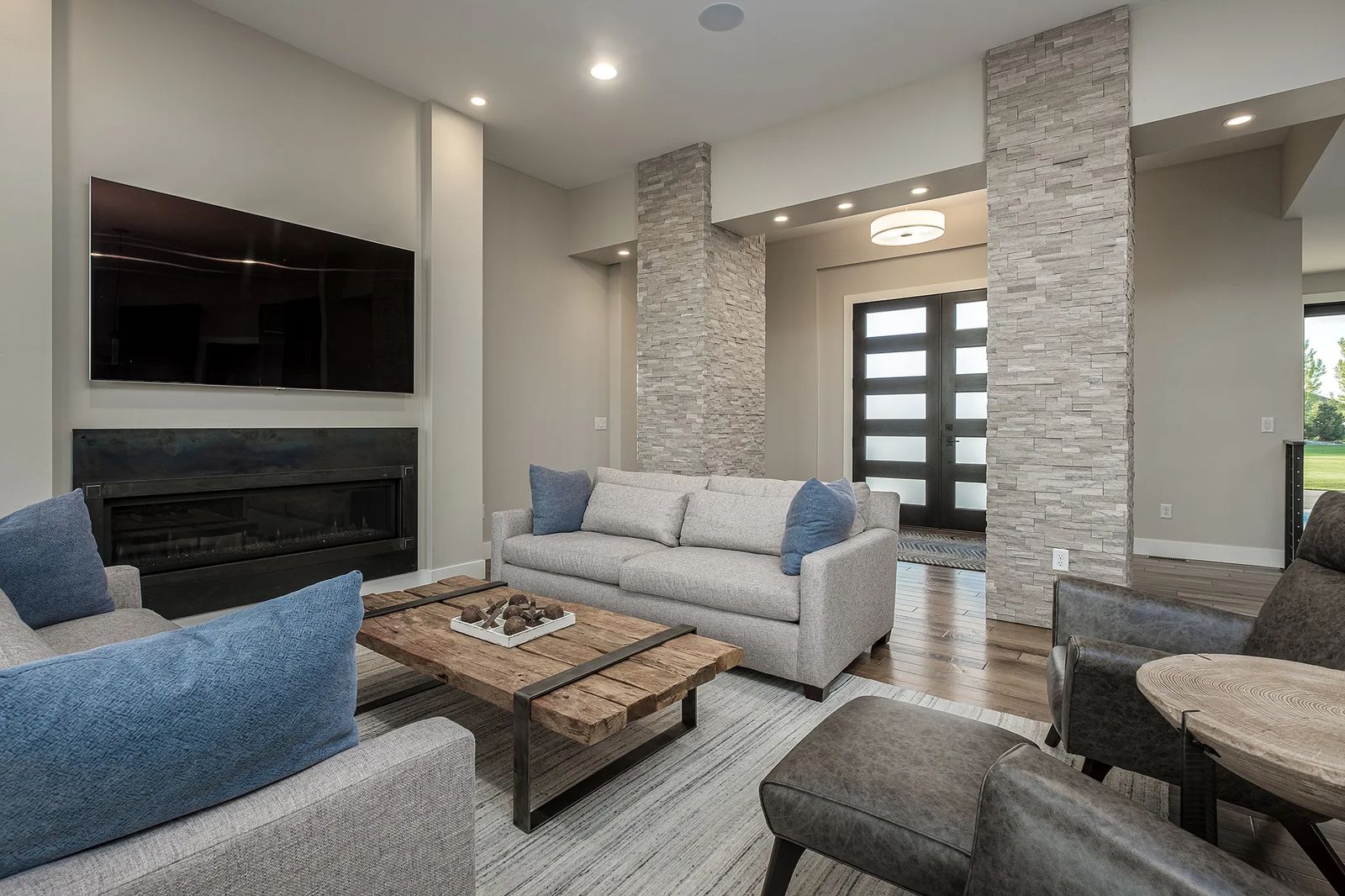 The home's exterior fits in harmoniously with the landscape of the area. Dark metal panels highlight the front entrance, presenting a subtly modern look to this Montana-inspired home. Cream-colored stonework crafted by Harper Masonry adds another layer of artisanship to the home's facade. This earthy element forms a dramatic feature inside, as well. Two stone columns offer a grand entrance from the front foyer into the living area.