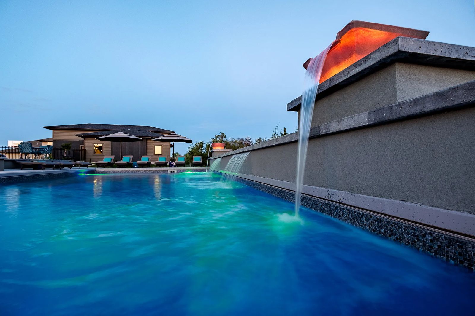 The 20-by-40-foot vinyl liner pool commands attention with gray mosaic interior and all-concrete exterior. "Its elevated wall with magic bowls on either end flicker with lights inside," says John Davidson, owner of 5 Star Pool and Spa Service. The bowls empty, creating dazzling waterfalls that look like fire. "It's a feature wall on automation. You can control the lighting with your phone," he says.