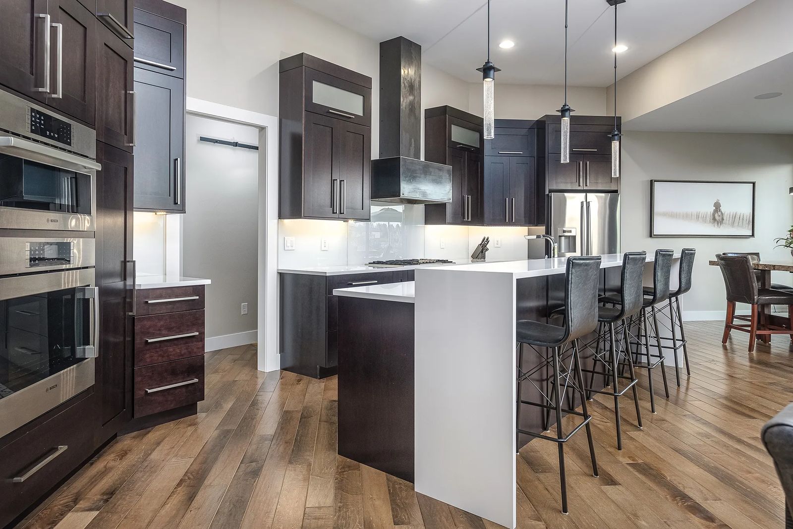 Medium-toned engineered maple hardwood flooring, also from Rimrock Cabinet Co., runs through the main level. "It all came together nicely," Joel says, "with a mountain/contemporary look."