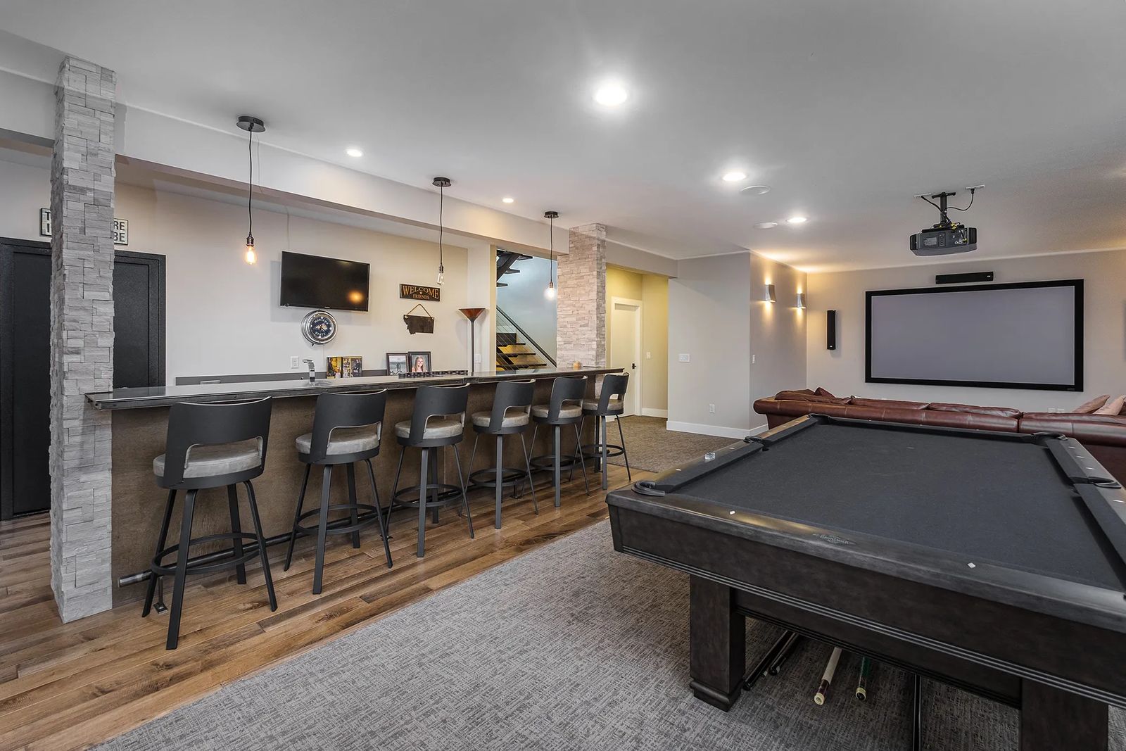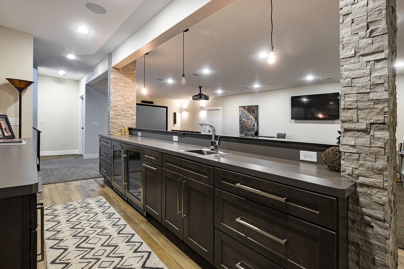 They can watch movies on the big screen in this open space and grab a soda or snack from the kitchen. Contemporary-style Bellmont cabinets from Rimrock Cabinet Co. contrast nicely with the light-colored stone columns.